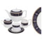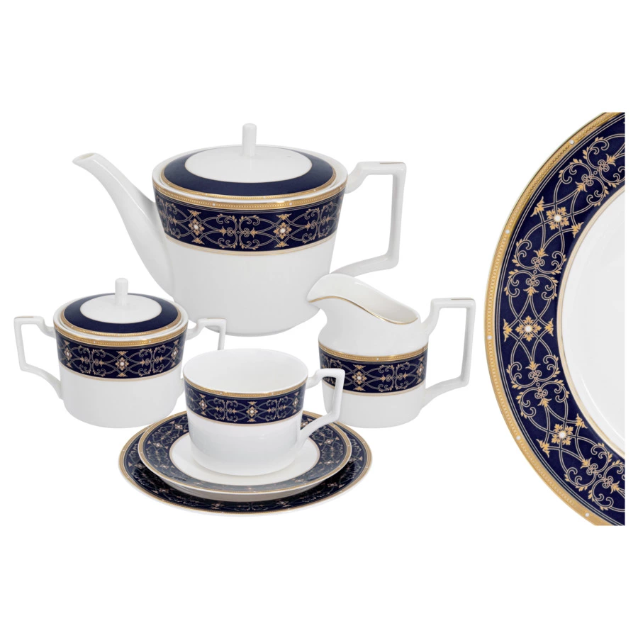 Комплектация: 6 чашек 0,3 л, 6 блюдец 15,5 см, 6 десертных тарелок 18,0 см, чайник 1,1 л, сахарница 0,28 л, молочник 0,26 л.