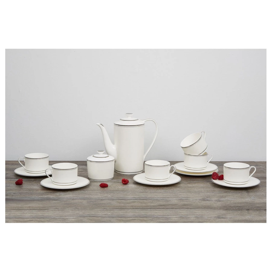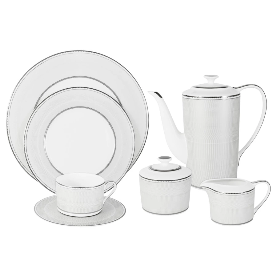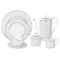Комплектация сервиза: 12 чашек 250 мл, 12 блюдец 17,0 см,12 закусочных тарелок 21,5 см, чайник 1,4 л, сахарница 350 мл, молочник 250 мл, блюдо для торта 31,0 см.