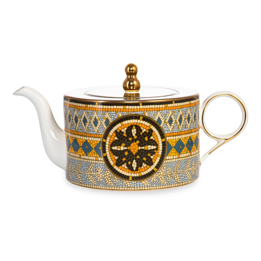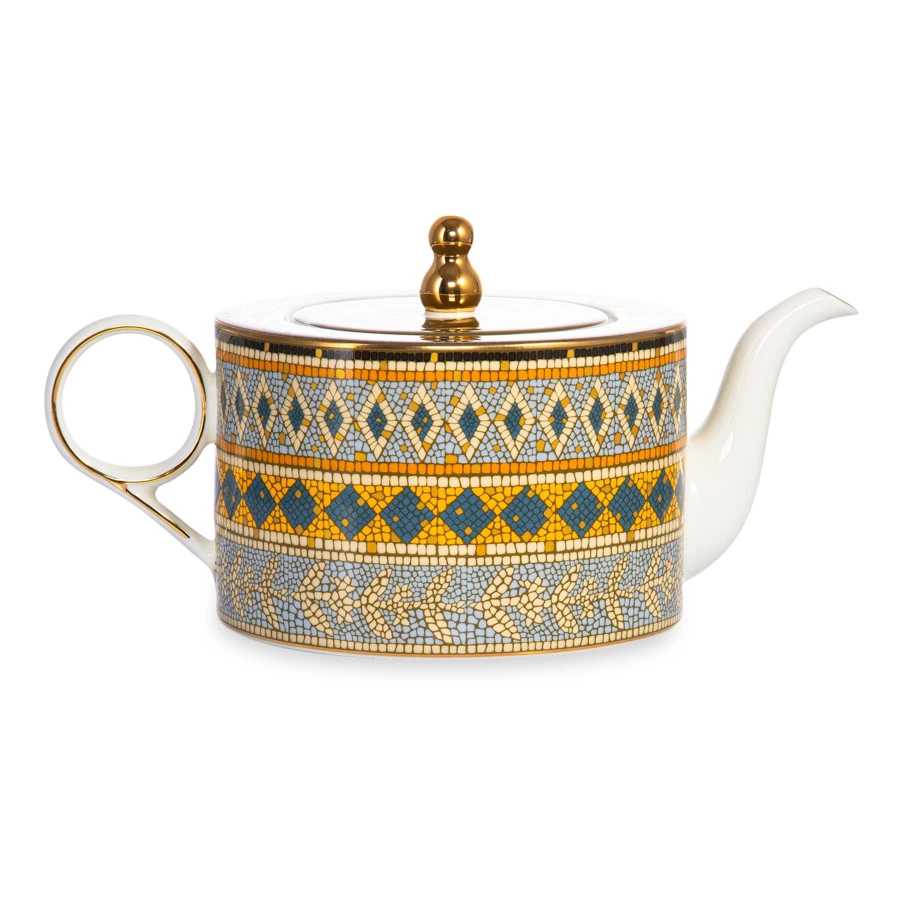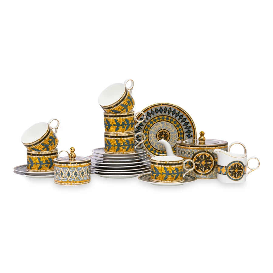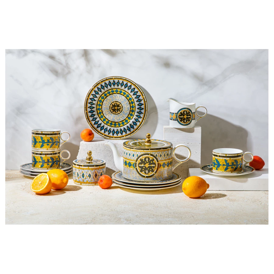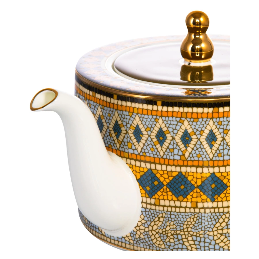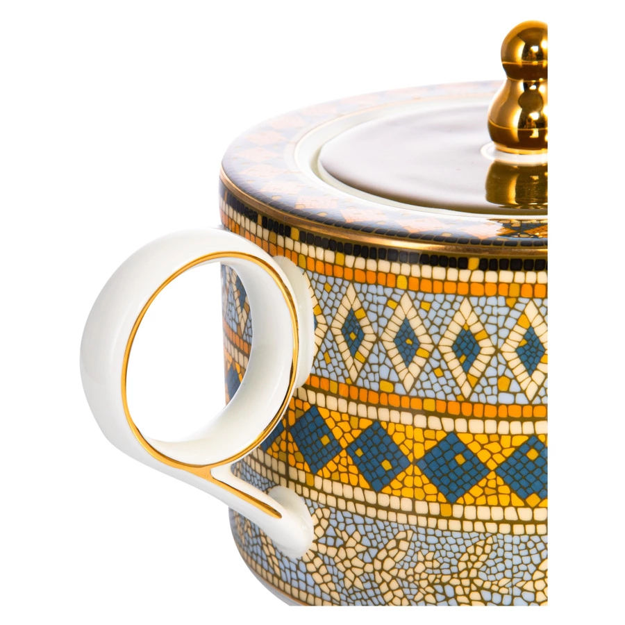 Чайный набор из серии «Олимп» — это достойное пополнение коллекции посуды и стильный подарок на свадьбу или новоселье. Предметы изготовлены из твёрдого фарфора высшего сорта и украшены эффектным декором. Геометрический орнамент, напоминающий мозаику – настоящая находка дизайнеров бренда Mix&Match Home. Золотая отделка деликатно подчёркивает необычное оформление. Многоэтапный обжиг обеспечивает долговечность и чёткость рисунка, сохраняет насыщенность красок. Сервиз с ярким дизайном приятно удивит гостей, создавая за столом особенную атмосферу.