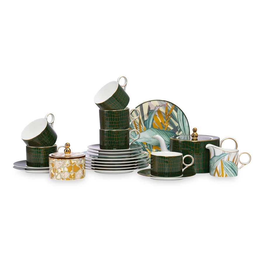 Посуда из коллекции «Сафари» бренда Mix&Match Home наполнит интерьер особенным колоритом. Смелый декор изделий выполнен в изумрудно-зелёной и золотисто-песочной палитре, напоминающей природные краски экзотического африканского континента. Золотая отделка красиво оттеняет растительный узор и анималистичный принт, придавая посуде роскошный внешний вид. Вы можете быть уверены – в таком обрамлении любое ваше блюдо будет смотреться очень эффектно. Лаконичные формы предметов уравновешивают яркий дизайн, позволяя использовать изделия в различных сервировочных комбинациях.