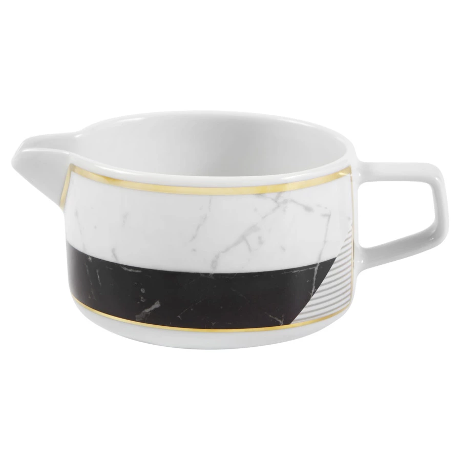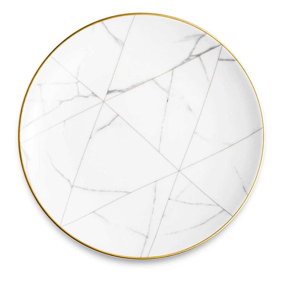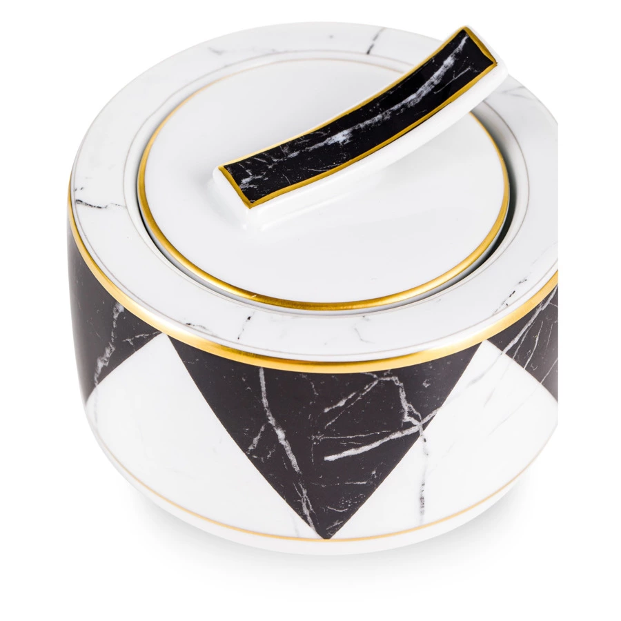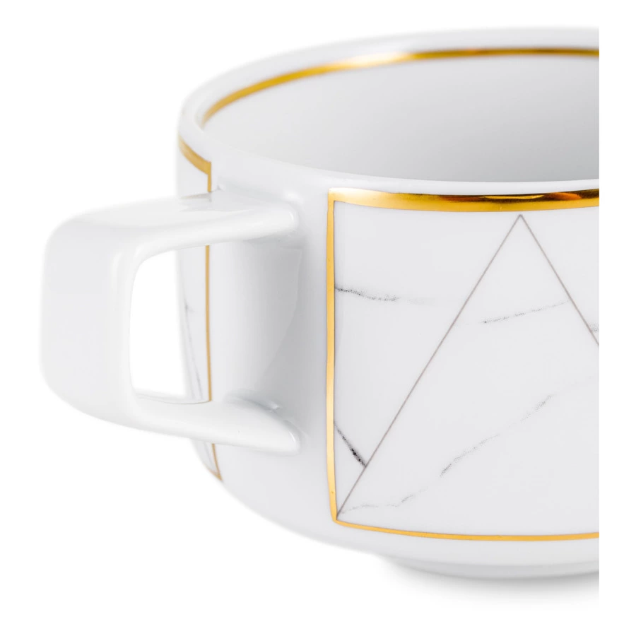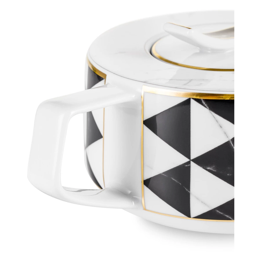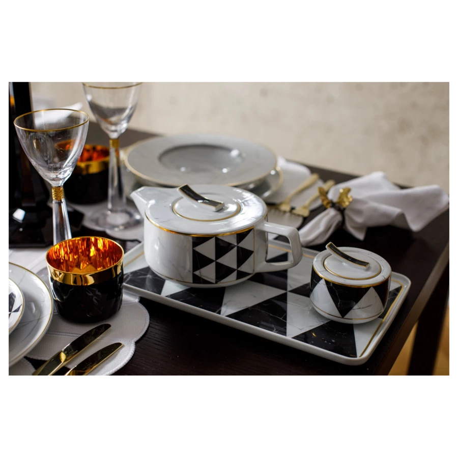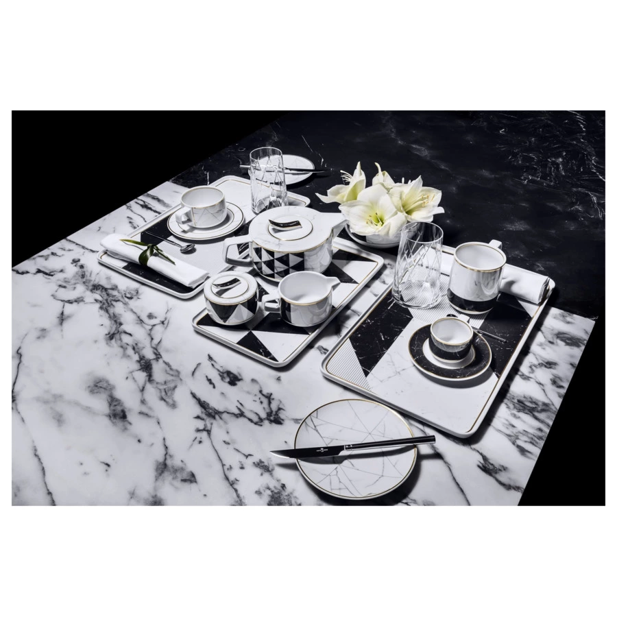 Контрастный дизайн сочетает геометричный орнамент с плавными узорами каррарского мрамора. У каждого предмета – свой особый рисунок. Посуда изготовлена из практичного фарфора, который вручную декорирован золотым кантом.