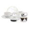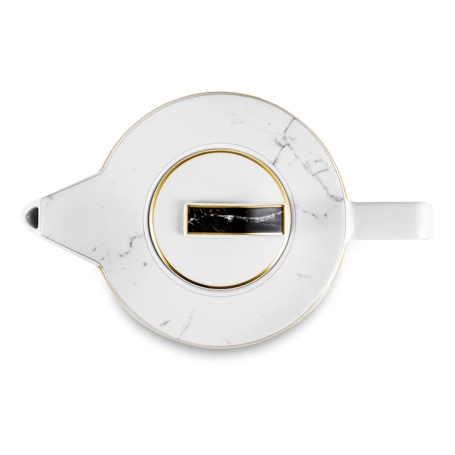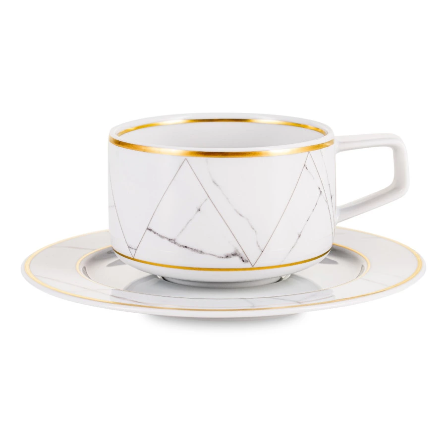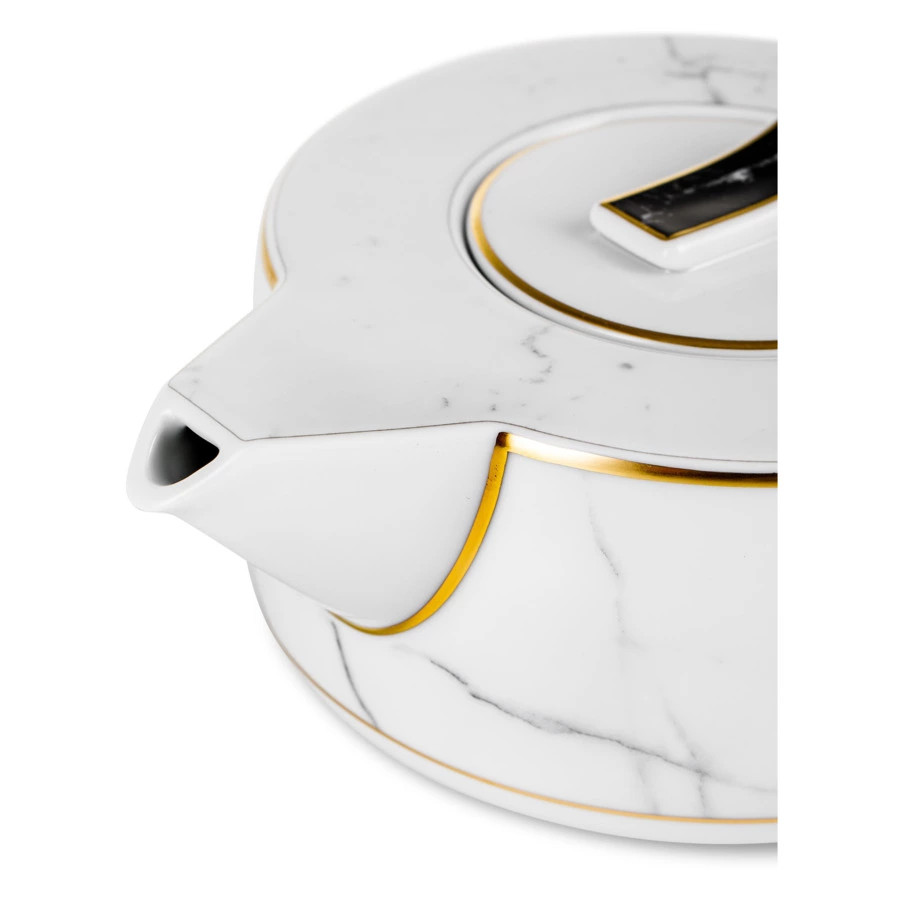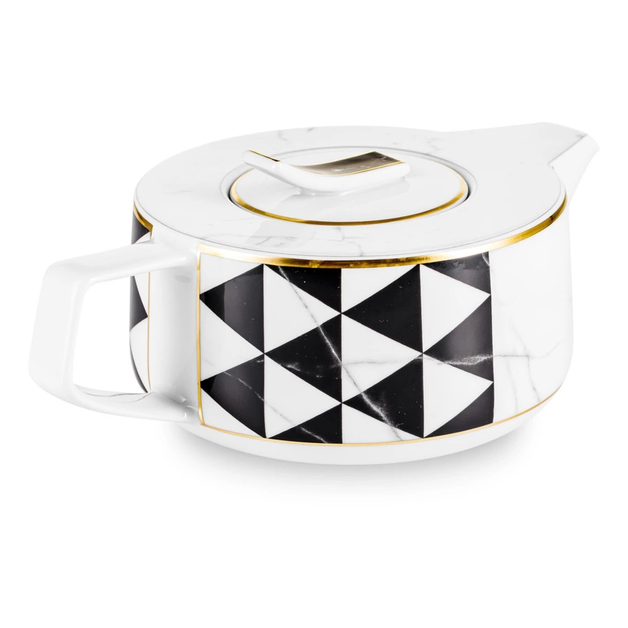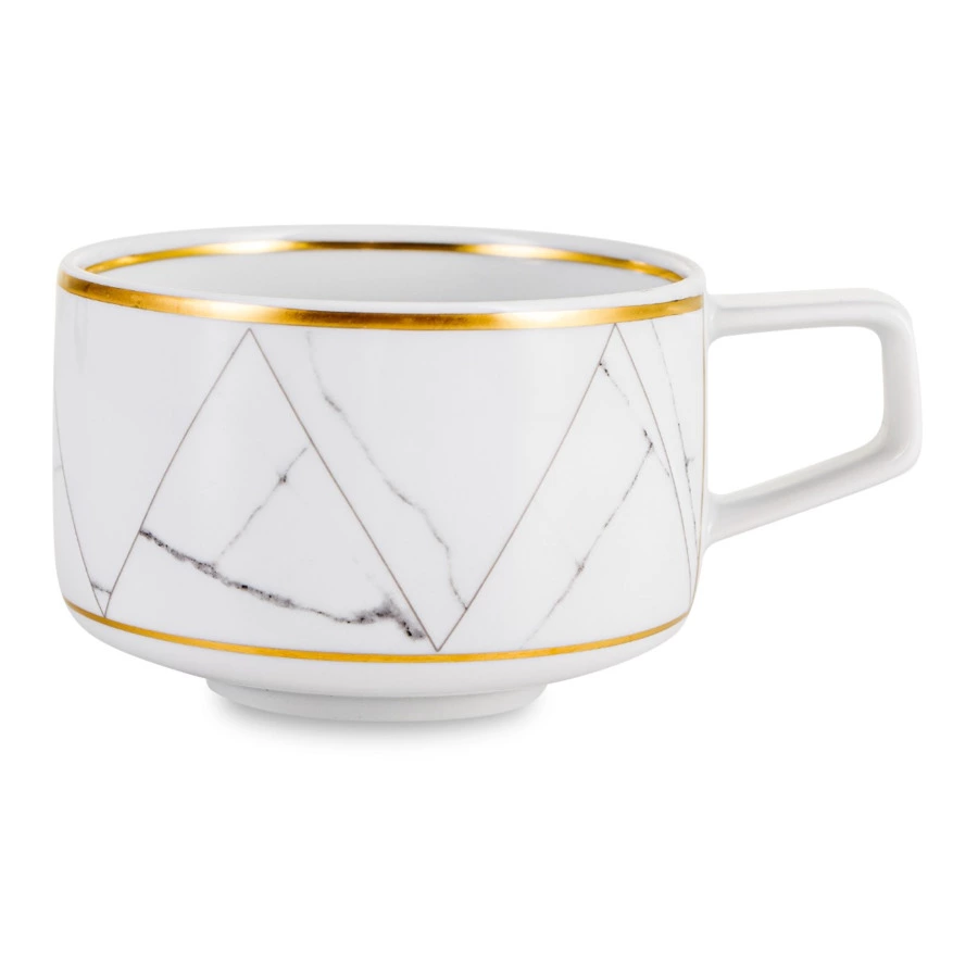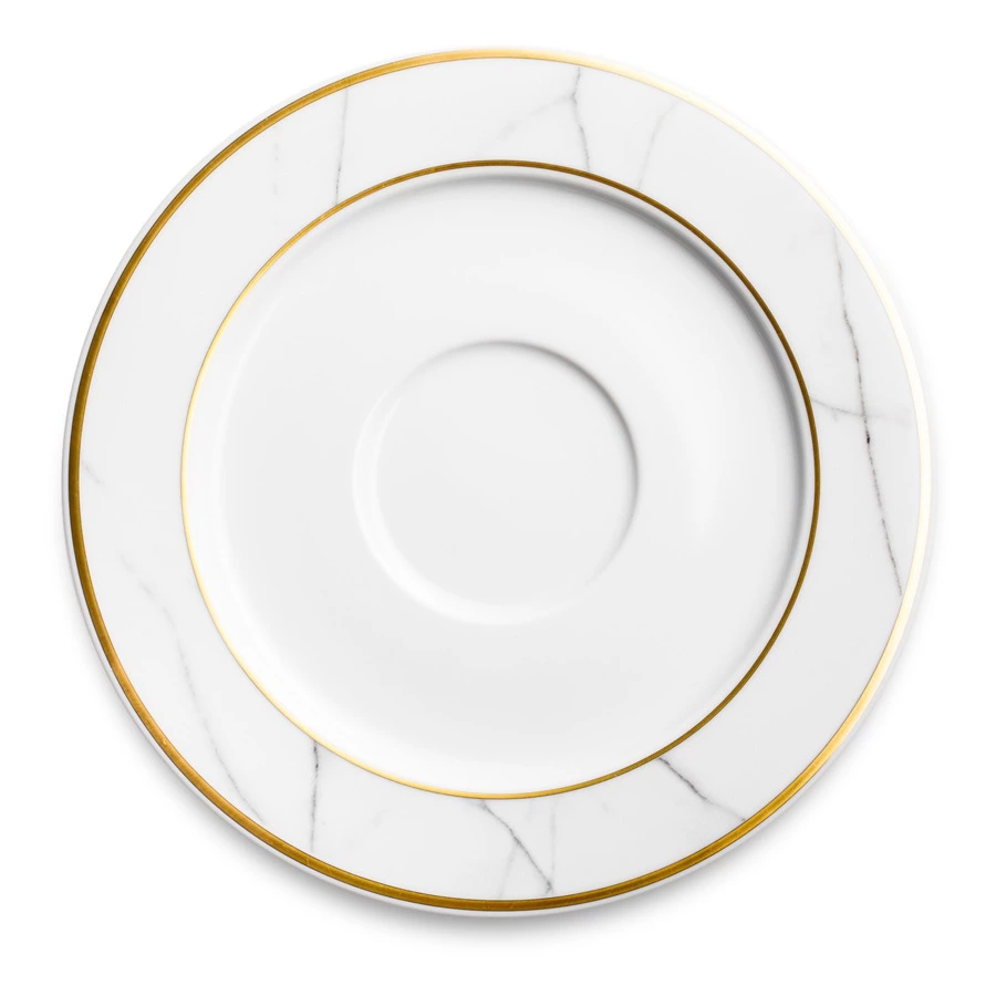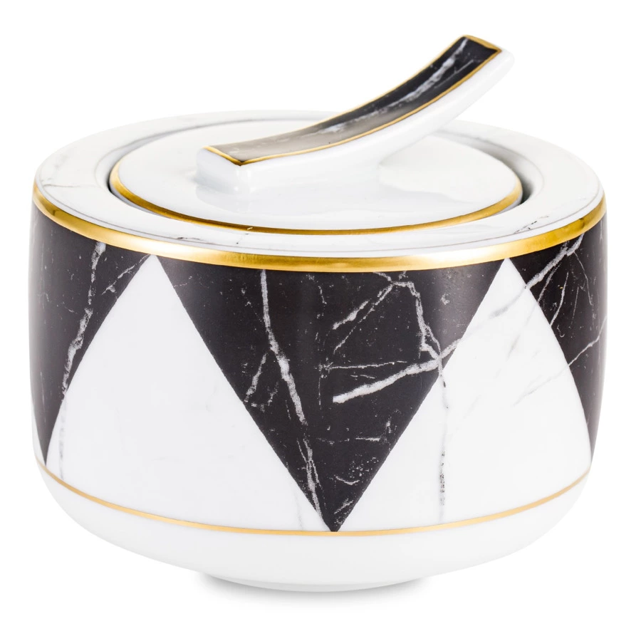 Контрастный дизайн сочетает геометричный орнамент с плавными узорами каррарского мрамора. У каждого предмета – свой особый рисунок. Посуда изготовлена из практичного фарфора, который вручную декорирован золотым кантом.