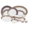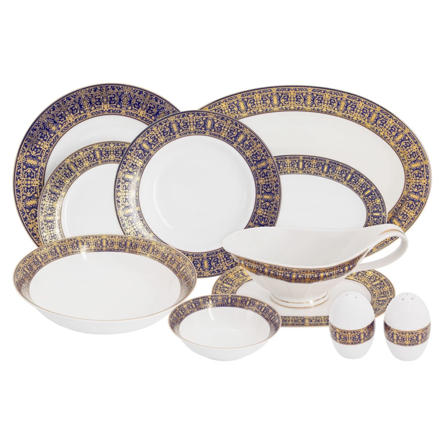 6 закусочных тарелок 20,5 см, 6 обеденных тарелок 27,0 см, 6 суповых тарелок 23,0 см, 2 салатника 14,0 см, 1 салатник 23,0 см, 1 блюдо 35,0 см, 1 блюдо 23,0 см, соусник с блюдцем, солонка, перечница.