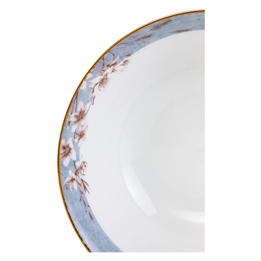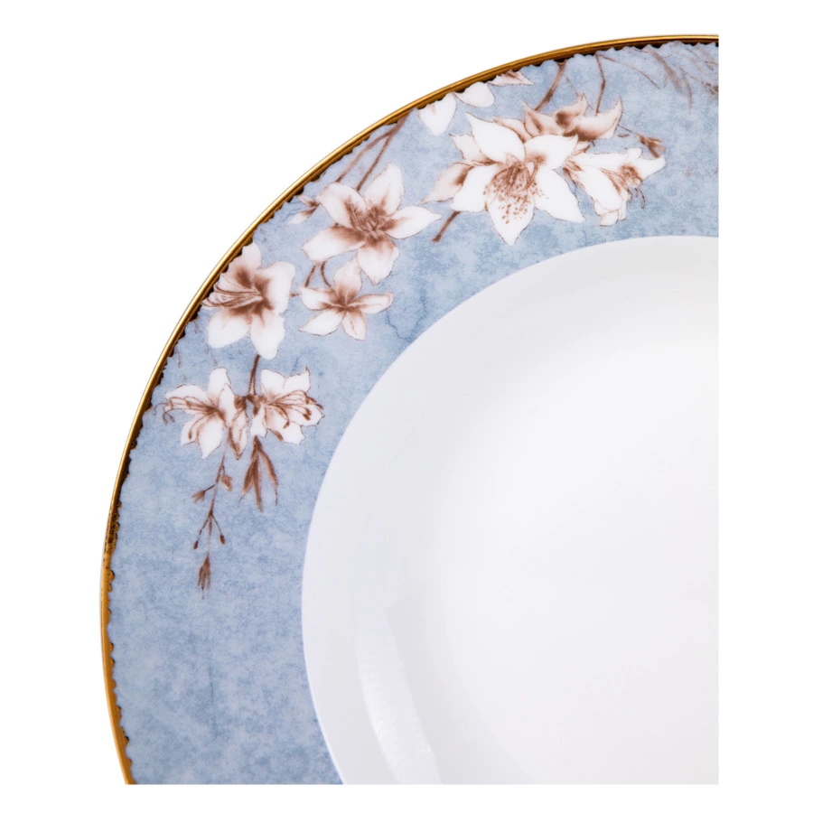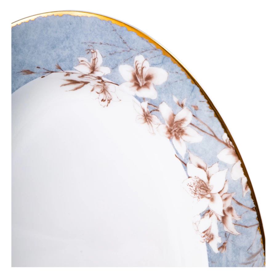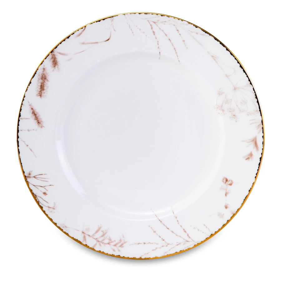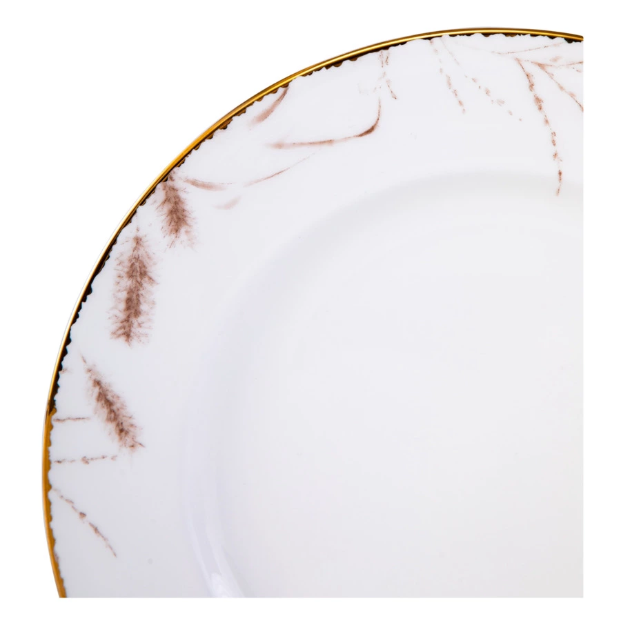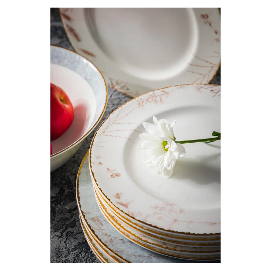Столовый сервиз на 6 персон из коллекции «Аурелия» от Mix&Match Home включает в себя большое блюдо, салатники и 3 вида тарелок: обеденные, суповые и закусочные. Дизайн серии разработан английскими художниками. Монохромный растительный принт кофейного цвета подчёркивает мягкий оттенок топлёного молока, свойственный настоящему твёрдому фарфору. Золотая кайма, проходящая по краю, делает композицию целостной. Овальное блюдо, салатник, а также суповые и обеденные тарелки дополнительно украшены принтом, имитирующим голубой мрамор.