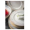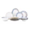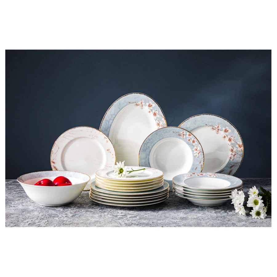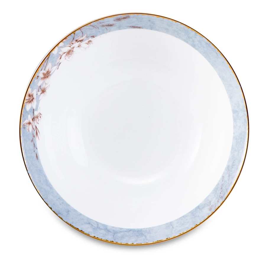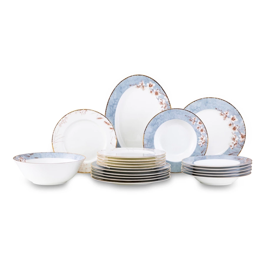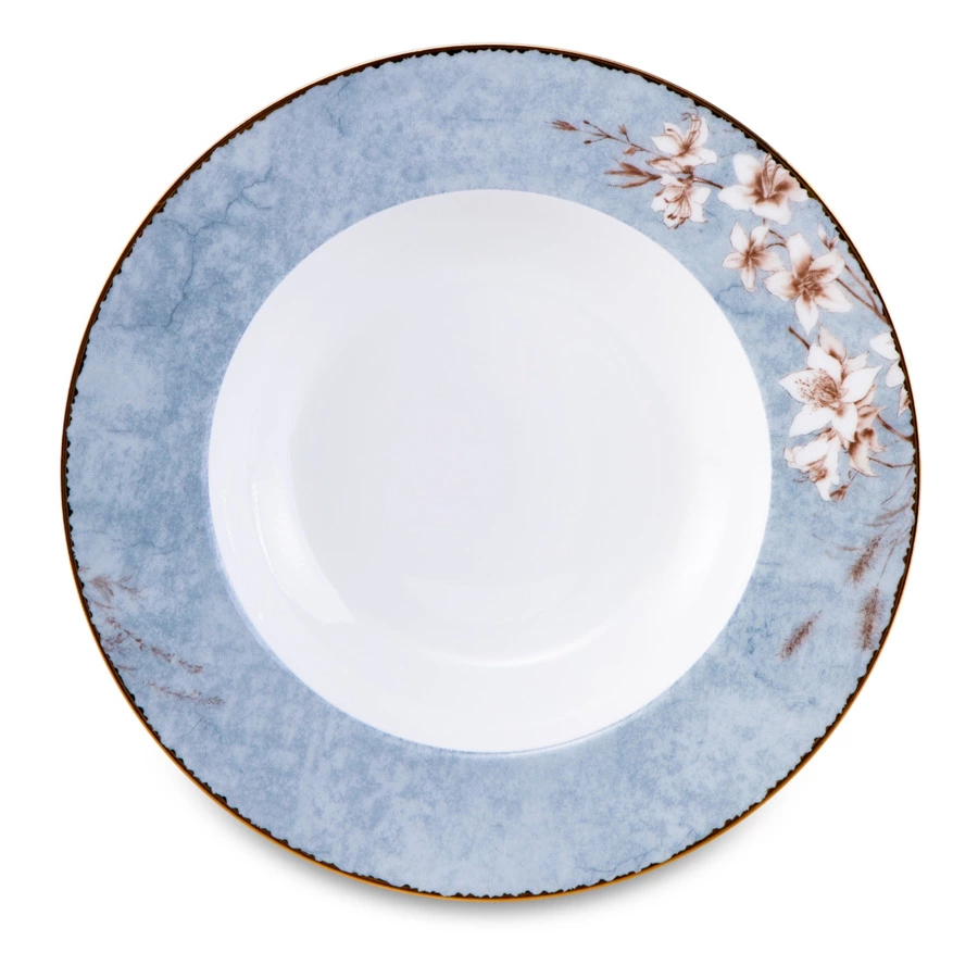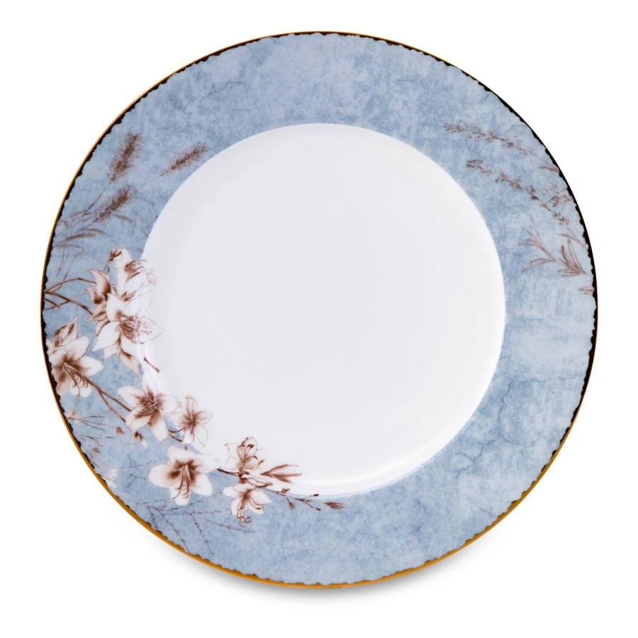 Столовый сервиз на 6 персон из коллекции «Аурелия» от Mix&Match Home включает в себя большое блюдо, салатники и 3 вида тарелок: обеденные, суповые и закусочные. Дизайн серии разработан английскими художниками. Монохромный растительный принт кофейного цвета подчёркивает мягкий оттенок топлёного молока, свойственный настоящему твёрдому фарфору. Золотая кайма, проходящая по краю, делает композицию целостной. Овальное блюдо, салатник, а также суповые и обеденные тарелки дополнительно украшены принтом, имитирующим голубой мрамор.