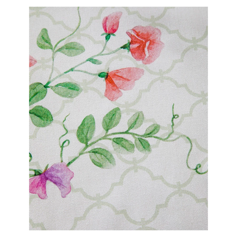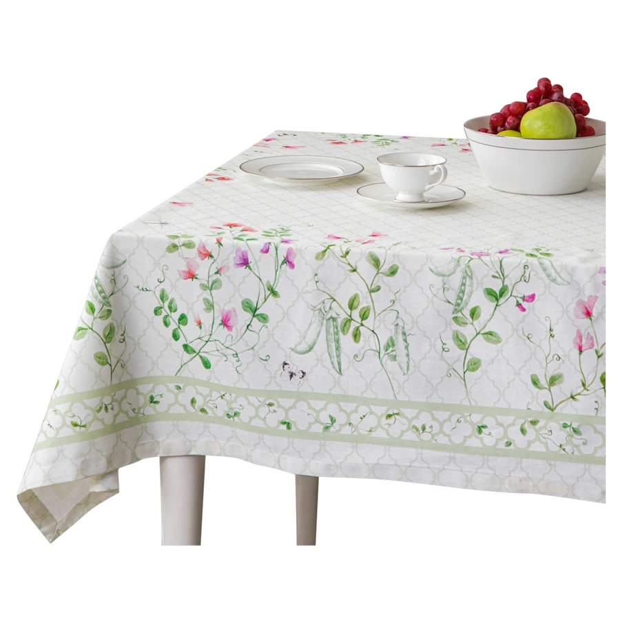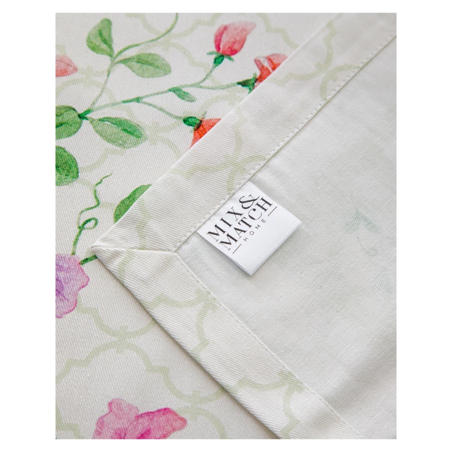 Прямоугольная скатерть из серии «Душистый горошек» бренда Mix&Match Home подойдет для сервировки повседневного или праздничного стола, добавит в жилое помещение уюта и весенней свежести. Нежный цветочный рисунок на нейтральном светлом фоне смотрится естественно, создаёт безмятежную пасторальную атмосферу.