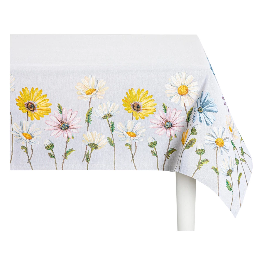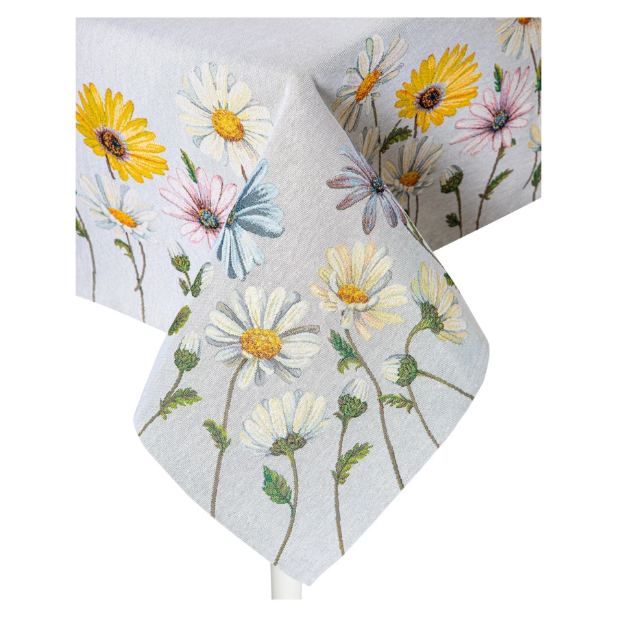 Изящная скатерть «Нежность» от бренда Mix&Match Home сделает любой обед или чаепитие по-семейному уютным. На нежно-голубом фоне текстильного полотна изображены крупные ромашки пастельных оттенков. Такое сочетание цветов придаёт интерьеру лёгкости и свежести. Благодаря плотной текстуре изделия по краям стола образуются ровные симметричные складки, а увеличенная износостойкость гобеленовой ткани гарантирует, что при правильном уходе скатерть прослужит не один десяток лет.