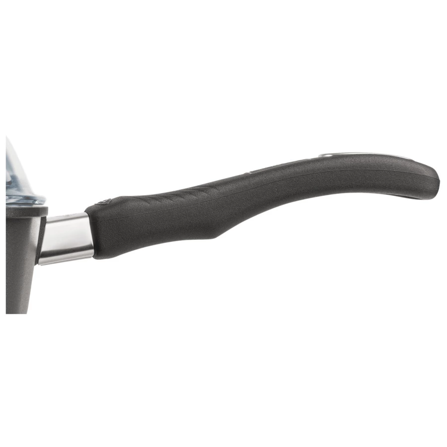 - Соединение рукояти со сковородой впаяно в алюминиевую массу изделия и на протяжении всего срока службы сковороды не ломается. Механизм фиксации у рукояти расположен снизу, что минимизирует загрязнение механизма. Особое расположение механизма фиксации ручки предохраняет руки от ожога при использовании в духовке