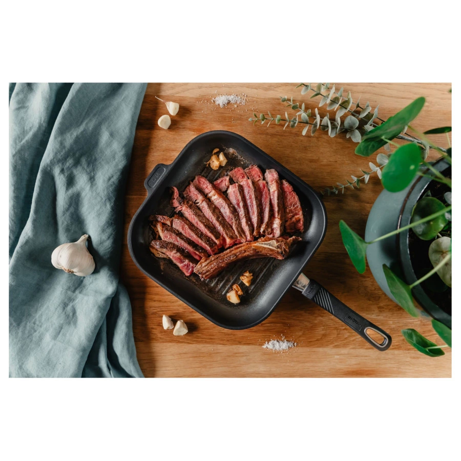 Идеальная сковорода с покрытием Biotan® Plus для отличных стейков, бургеров, овощей. Линии гриля Gastrolux идеально сбалансированы по высоте и ширине, что позволяет сохранить мясо сочным и нежным. Сохранение насыщенного вкуса и полезных веществ гарантировано.