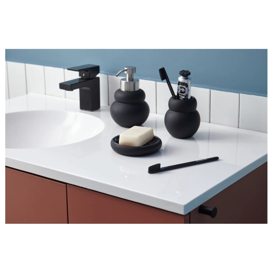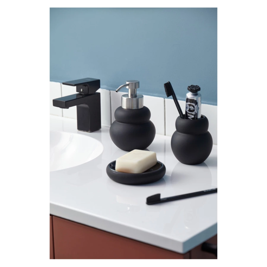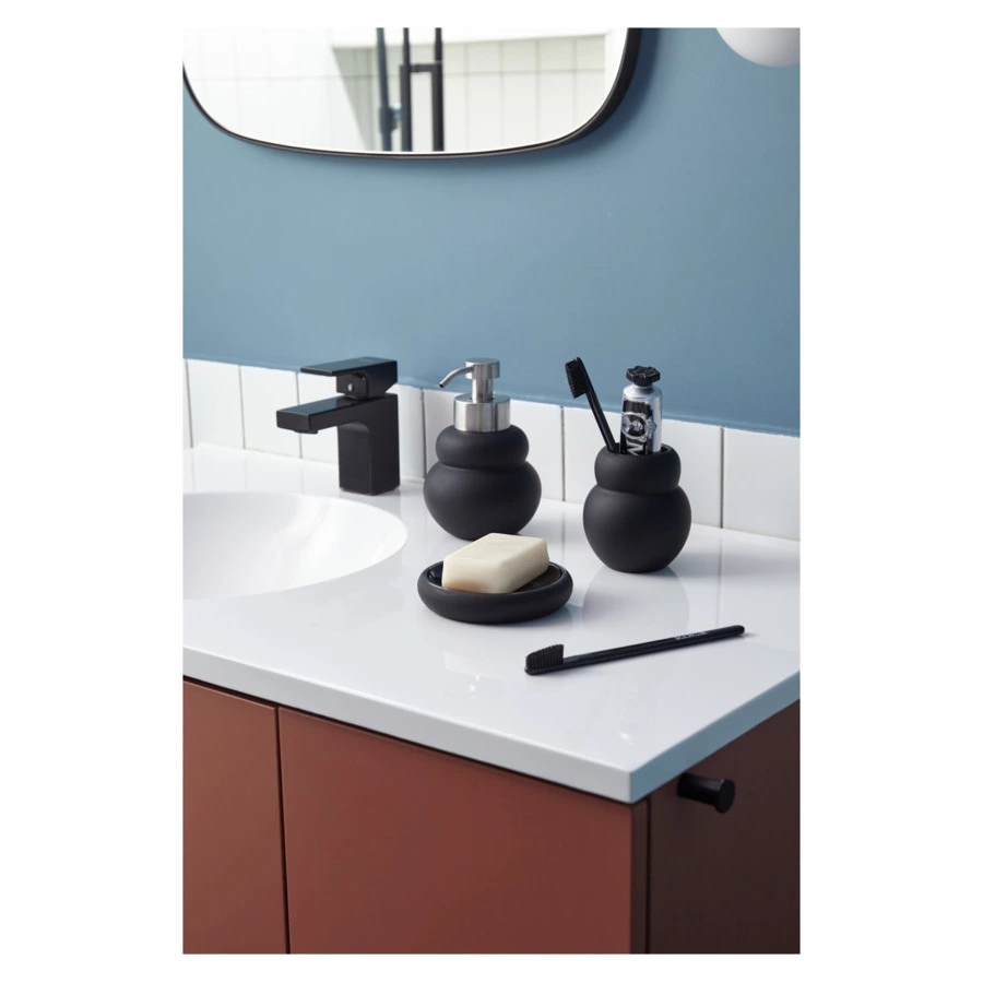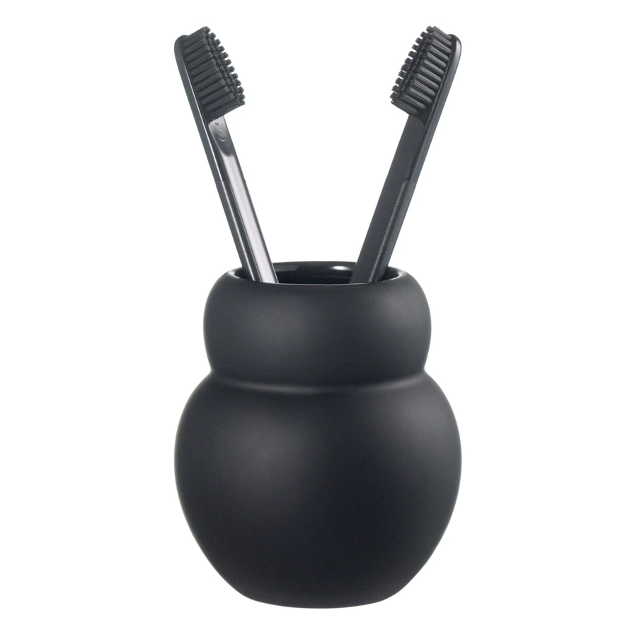 Стакан для зубных щеток Mark выполнен из керамики с матовым покрытием черного цвета. Материал экологичный, устойчив к воздействию влаги и температурным перепадам. Емкость компактных размеров занимает минимум места на раковине или полке. Комбинация матовых и глянцевых фактур делает дизайн интересным.