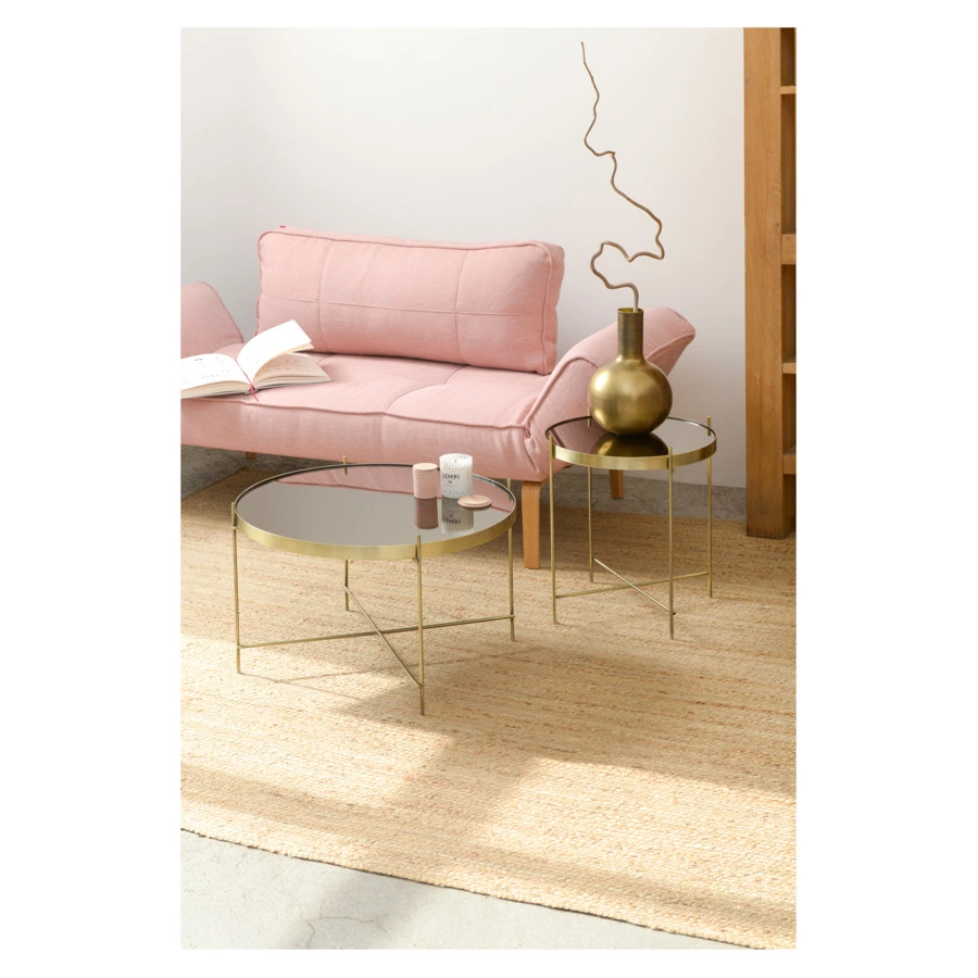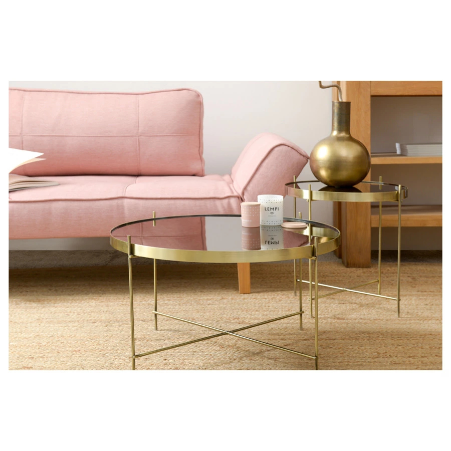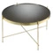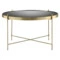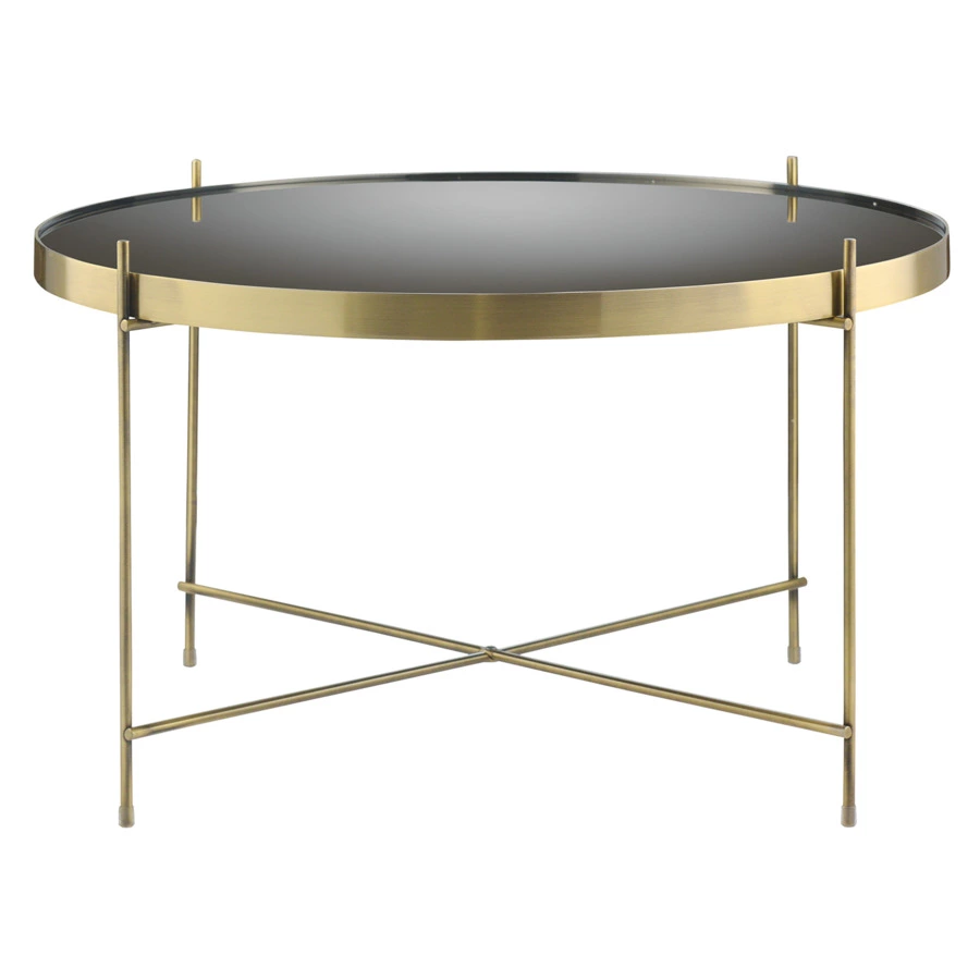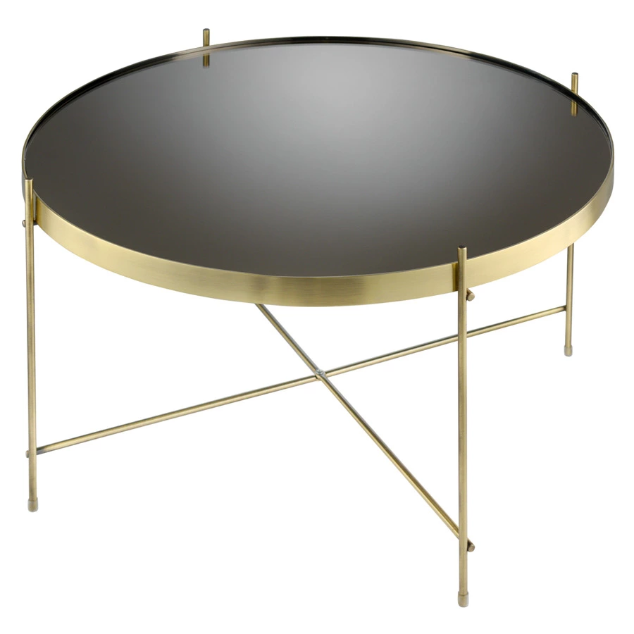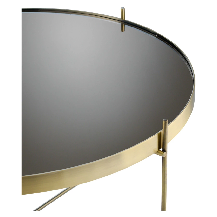 Материалы: столешница – коричневое зеркало, каркас – сталь с латунным напылением. Размеры: диаметр – 64,4 см, высота – 38 см.