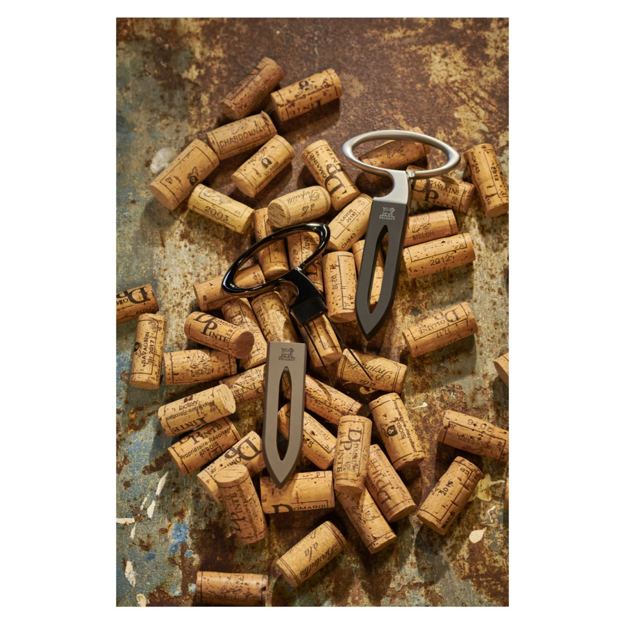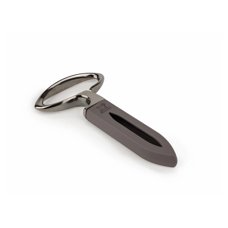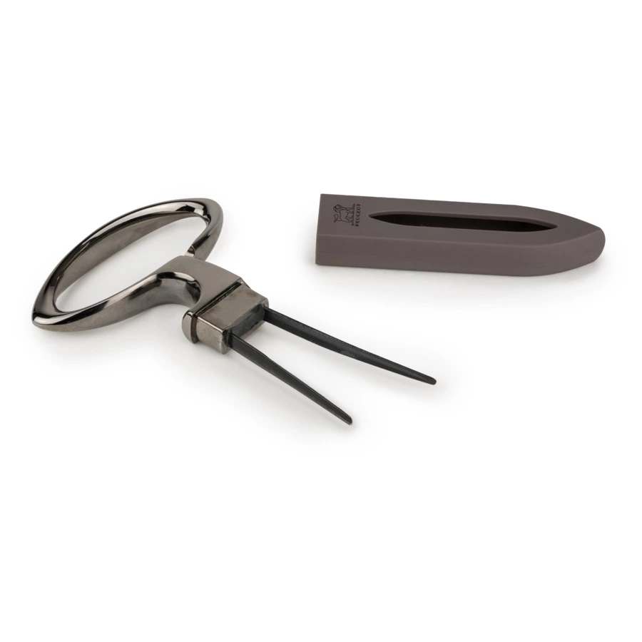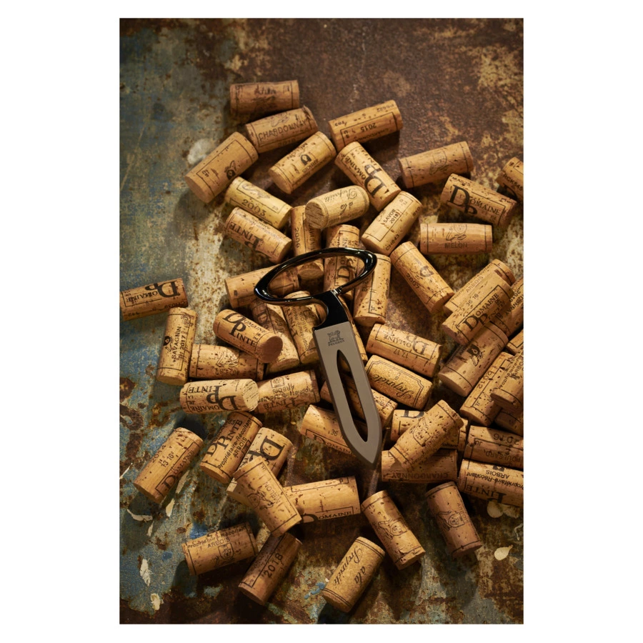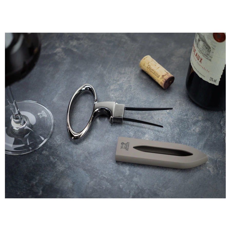 Штопор для хрупких пробок Peugeot Mathus иногда называют «цыганский» штопор или «друг дворецкого». Строением напоминает винтовой, только вместо спирали под ручкой находятся две пластины. Особенности: пробка при извлечении остаётся цельной и её можно вернуть назад без следов изъятия (а значит, можно незаметно попробовать любое вино). Им можно откупоривать старые вина, предотвращая повреждение даже самой хрупкой пробки. Предназначен в первую очередь для повреждённых пробок. Принцип работы: аккуратно покачивая ввести пластины в горлышко, захватив пробку, затем плавно провернуть и вытащить её. Изготовлен из нержавеющей стали, пластиковый чехол цвете базальт.