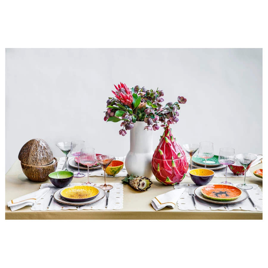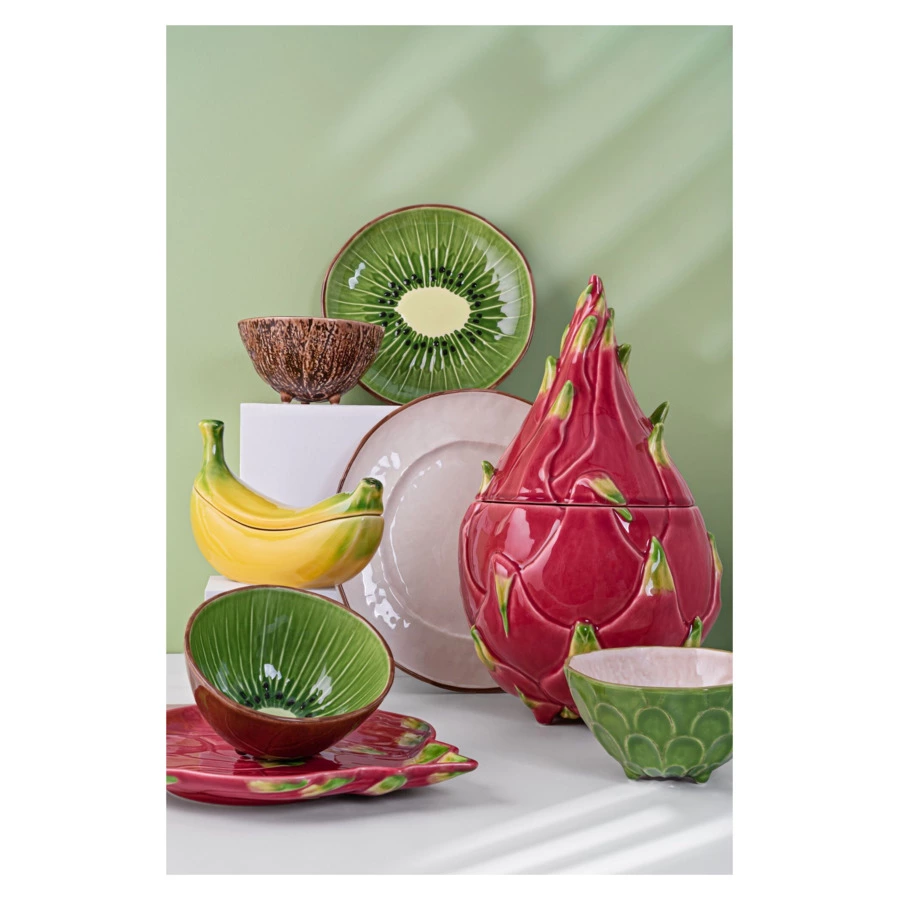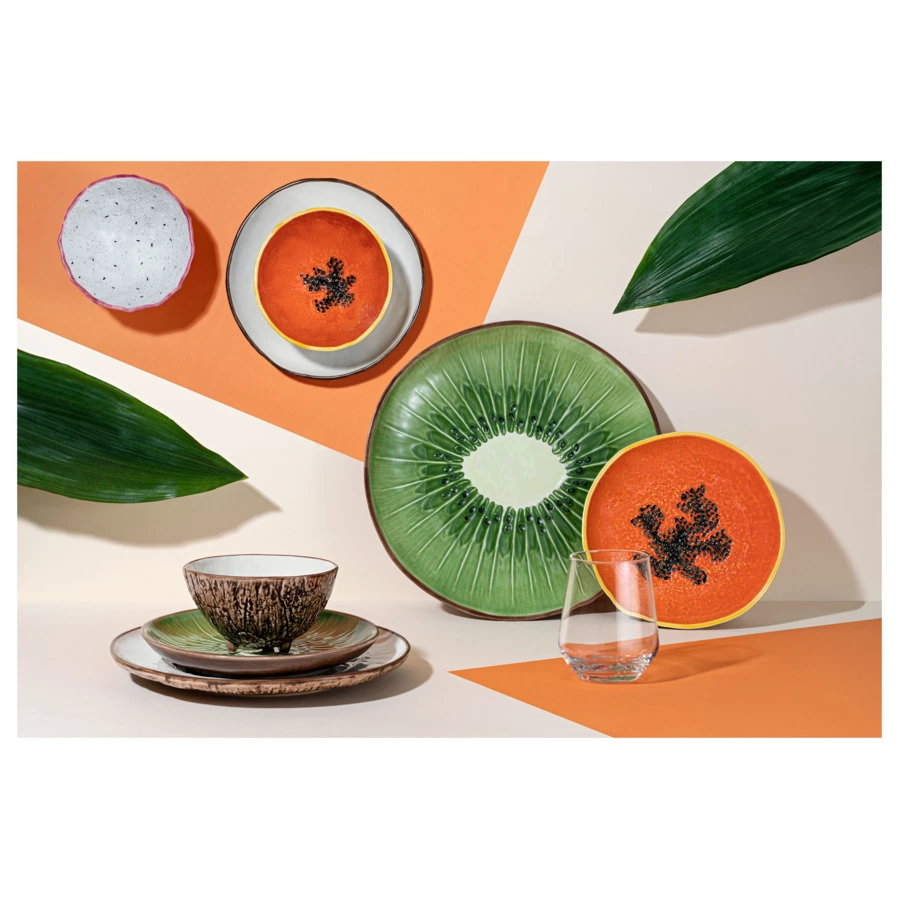 Новая коллекция от известного португальского производителя Bordallo Pinheiro — Tropical Fruits (Тропические фрукты) — это потрясающий гимн природе. Коллекция состоит из разнообразных предметов, включая тарелки, салатницы, блюда и чаши, которые можно комбинировать между собой для создания эклектичной сервировки и максимального визуального эффекта. Каждый предмет представляет собой невероятное и детальное изображение тропических фруктов. Киви, маракуйя, папайя, питайя, анона, кокос и авокадо — это всё новые декоры, выполненные в уникальном стиле Bordallo Pinheiro. Коллекция «Тропические фрукты» может быть как функциональной, так и декоративной.
