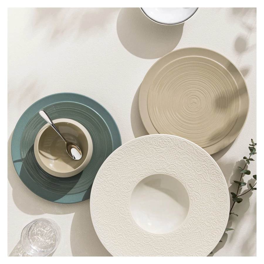 Коллекция Bahia от Degrenne – это гармоничное сочетание традиционных техник с новейшими трендами. Лаконичная, но вместе с тем эффектная посуда этой линейки органично впишется в современную сервировку. Дизайн предметов воплощает игру контрастов и фактур. Матовые чуть шероховатые поверхности сменяются глянцевой эмалью с рельефным рисунком в виде закрученного к центру вихря. Естественные оттенки серии отлично сочетаются с лаконичным исполнением тарелок, салатников, соусников, кувшинов и разделочных досок.