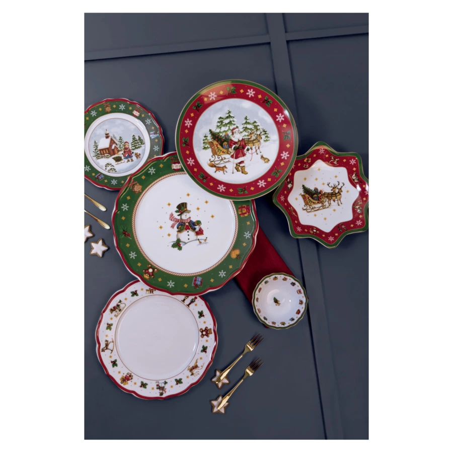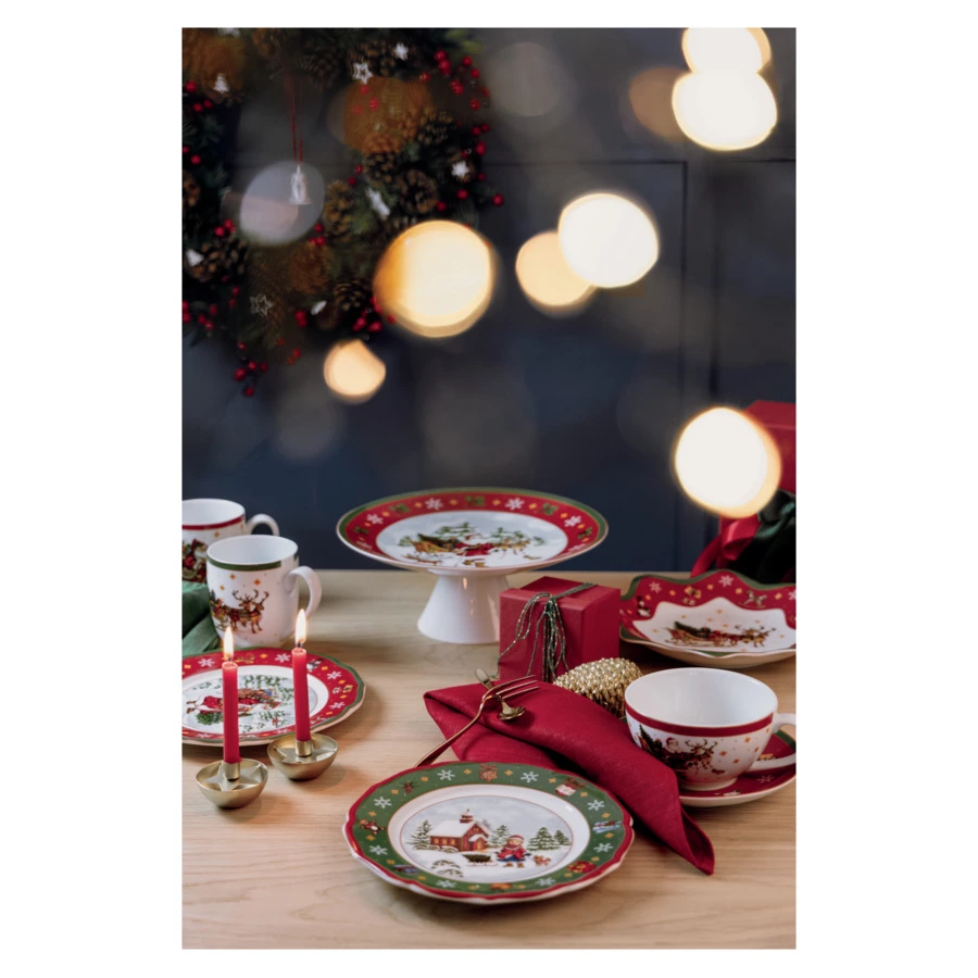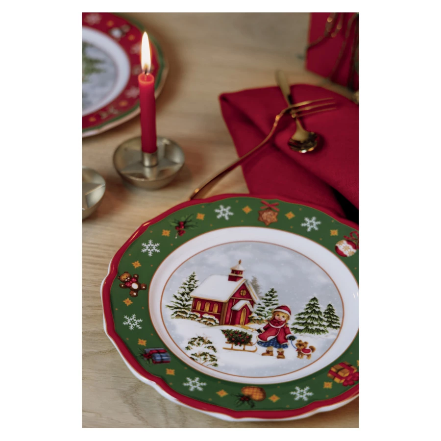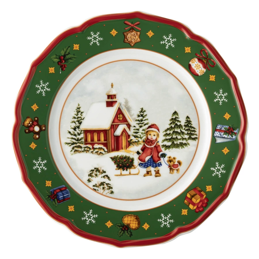 Закусочная тарелка из коллекции «Зимняя пора» немецкого бренда Hutschenreuther – это настоящая мини-картина, где холстом служит белоснежный фарфор. Центр блюда украшен заснеженным пейзажем, на переднем плане которого изображена девочка с санками и щенком. Волнистый край зелёного цвета декорирован новогодней атрибутикой и дополнен деликатной красной каёмкой. Нарядную тарелку можно использовать не только как предмет сервировки, но и как элемент декора праздничного интерьера. Красочное изделие станет чудесным подарком в преддверии зимних праздников.