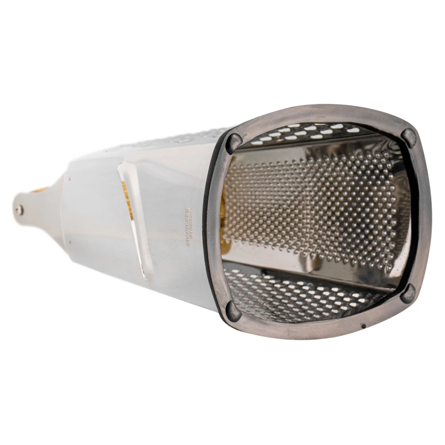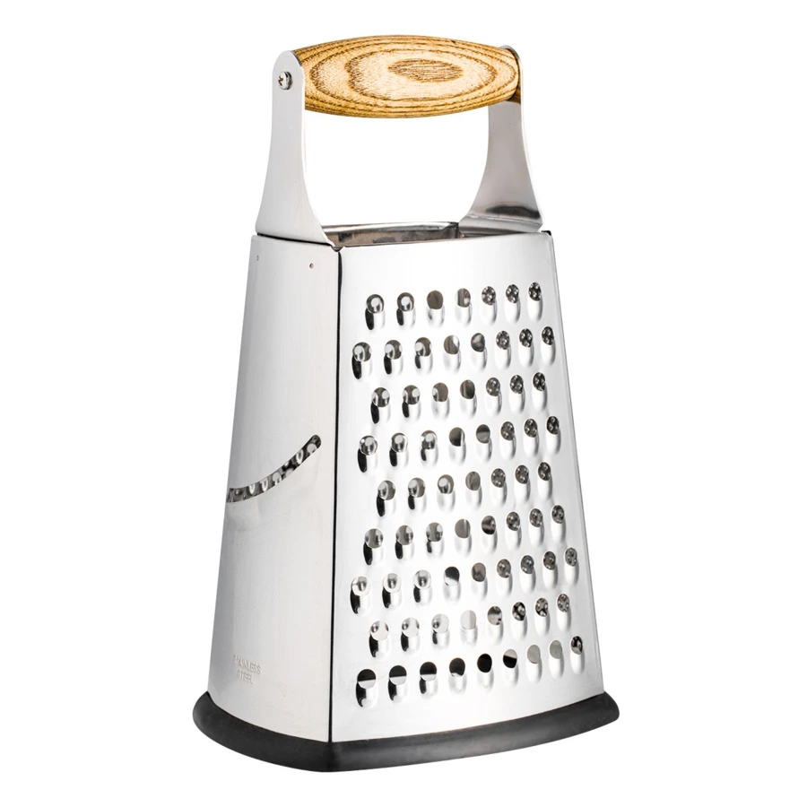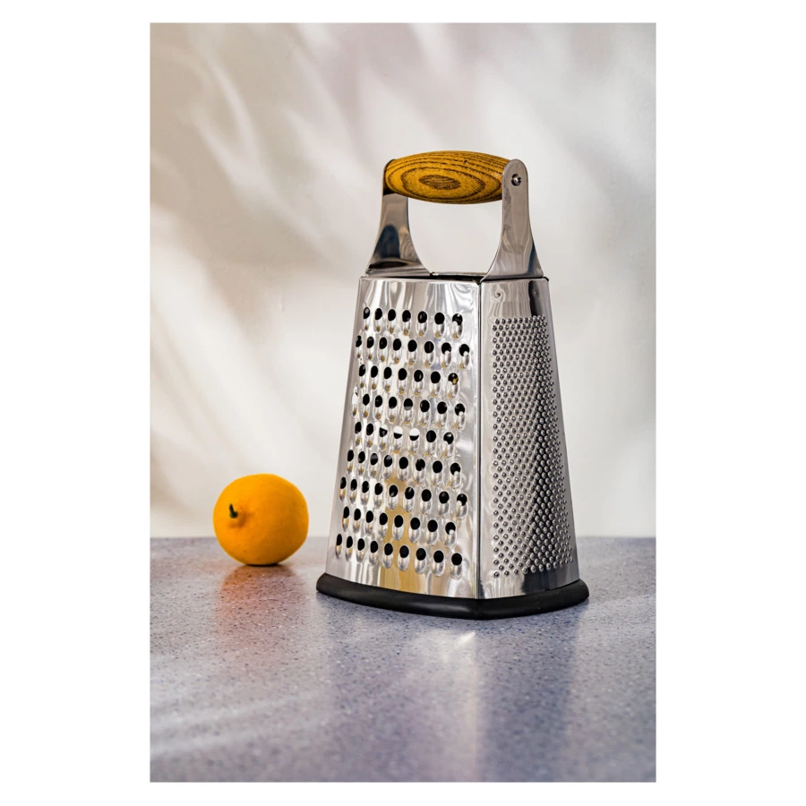 Настольная тёрка с четырьмя режущими поверхностями позволит вам быстро измельчить и нашинковать овощи, фрукты и другие продукты. Тёрка изготовлена из нержавеющей стали, имеет ручку из термически обработанного ясеня, нескользящее основание делает её очень удобной в применении.