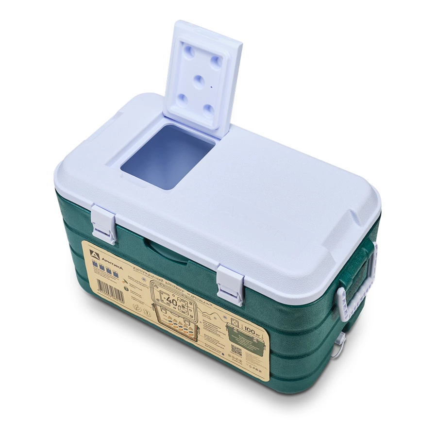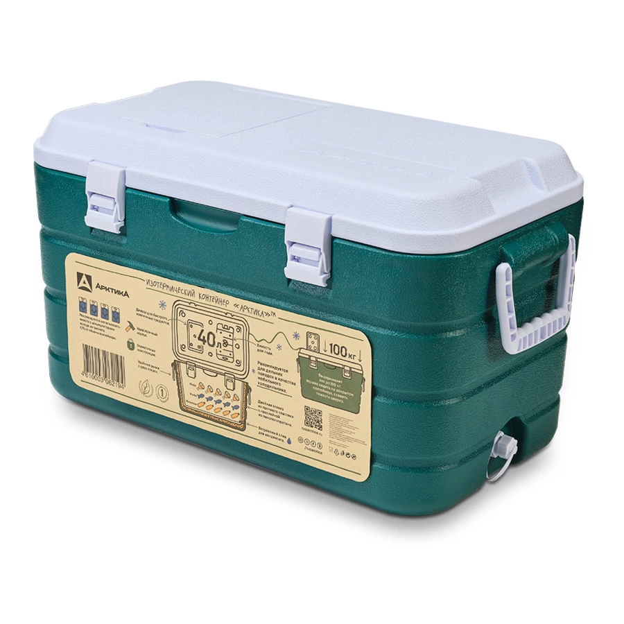 Изотермический контейнер, объем 40 л, с окошком на крышке для легкого доступа, ручки с двух сторон, встроенный слив для конденсата. Внутренние размеры 54х27х28 см. Двойная стенка из ударопрочного материала с прослойкой из пенополиуретана. Ударопрочный корпус.
