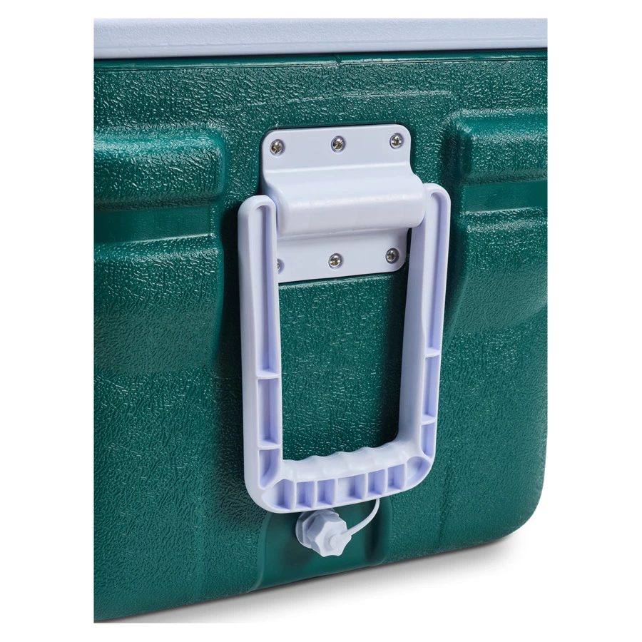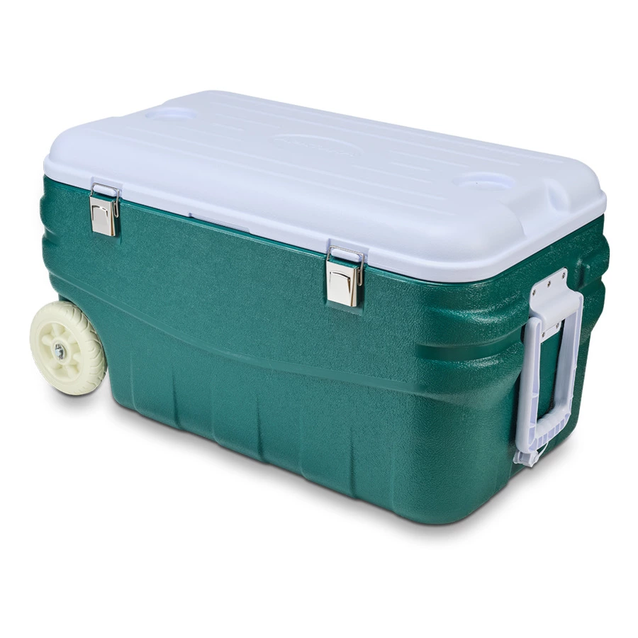 Изотермический контейнер, объем 80 л, складная ручка, встроенный слив для конденсата, колеса для удобного перемещения. Внутренние размеры 68х32х35 см. Двойная стенка из ударопрочного материала с прослойкой из пенополиуретана. Герметичная контсрукция, ударопрочный корпус.