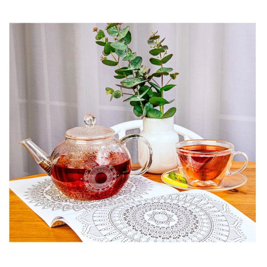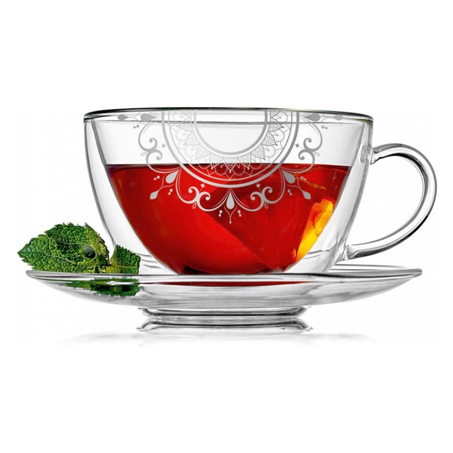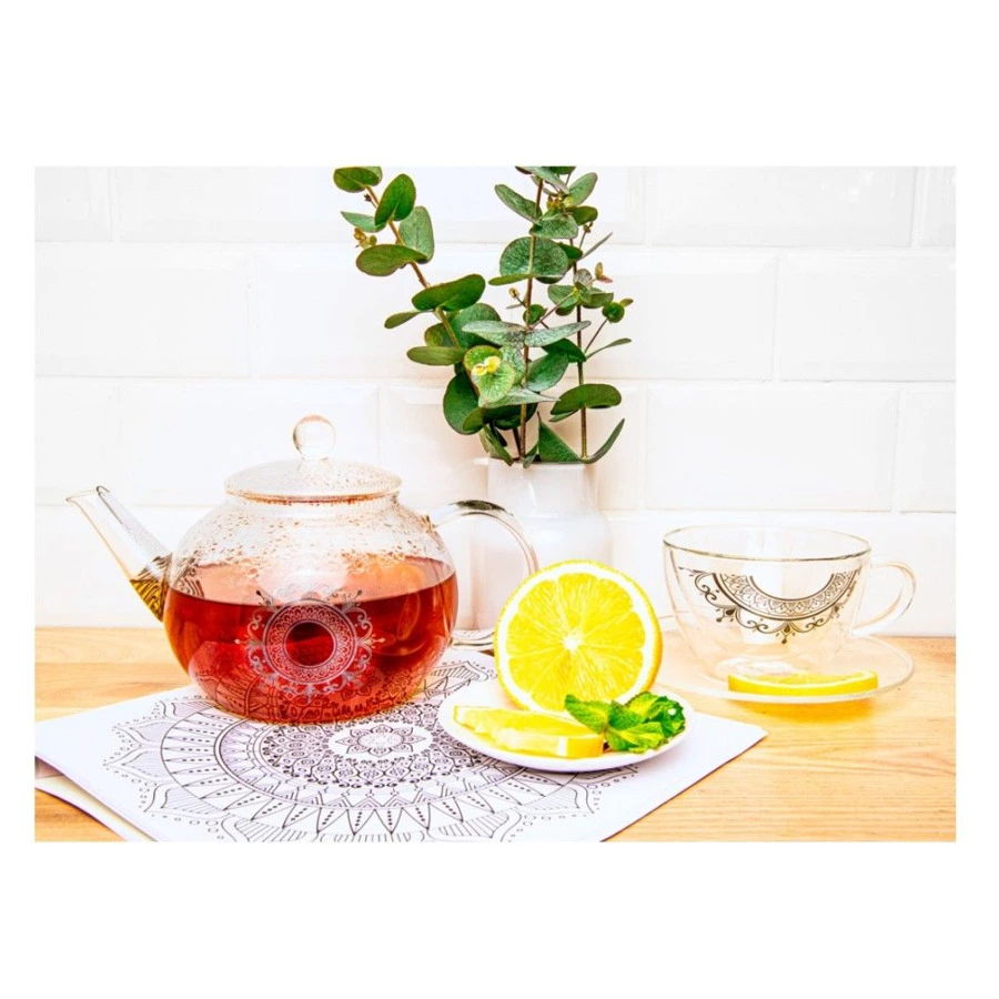 Чайная пара Arabesque выполнена из термостойкого боросиликатного стекла, выдерживающего температуру от -20 °C до +280 °C. Изделие ручной работы украшено арабеской глубокого серого с серебринкой цвета: на контрасте с тёмной жидкостью рисунок словно мерцает.