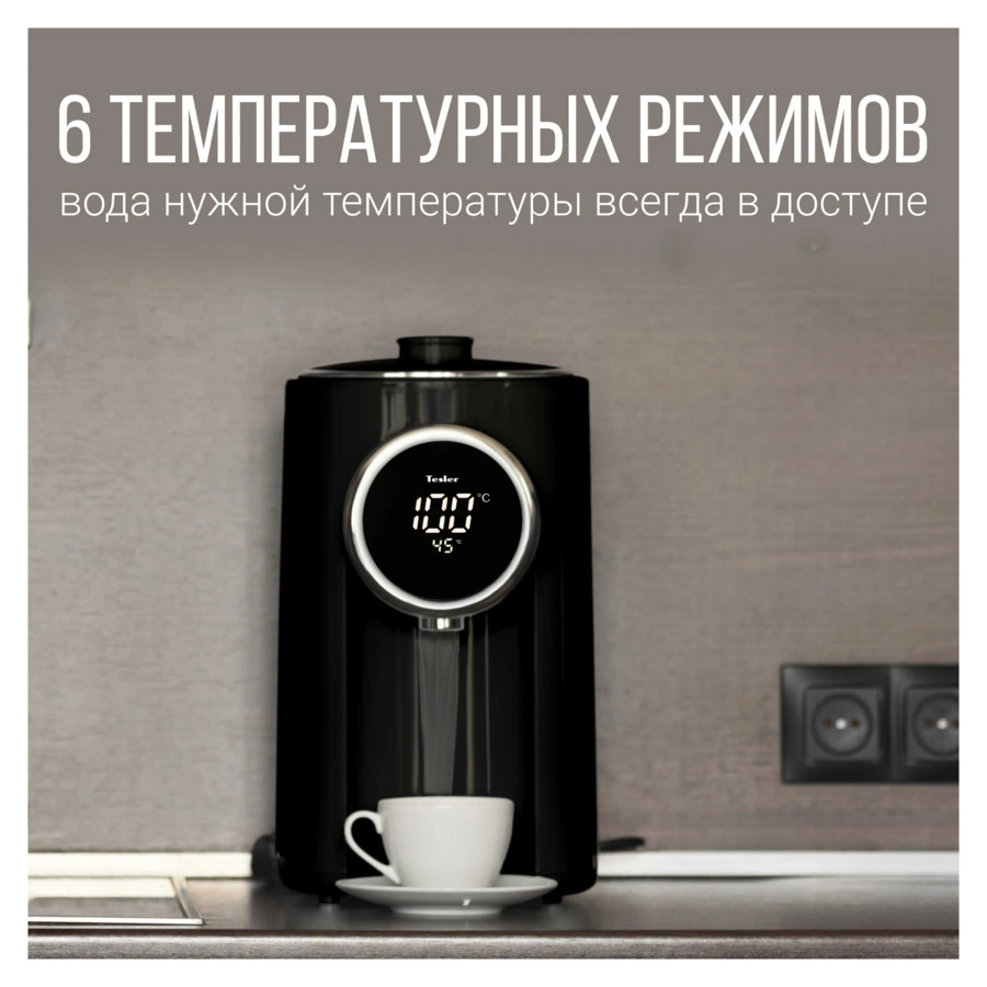 Термопот Tesler Margherita TP-5060 не только кипятит воду, но и нагревает её до одного из шести предустановленных значений (95, 85, 75, 65, 55, 45 градусов). Выбранная температура поддерживается постоянно.