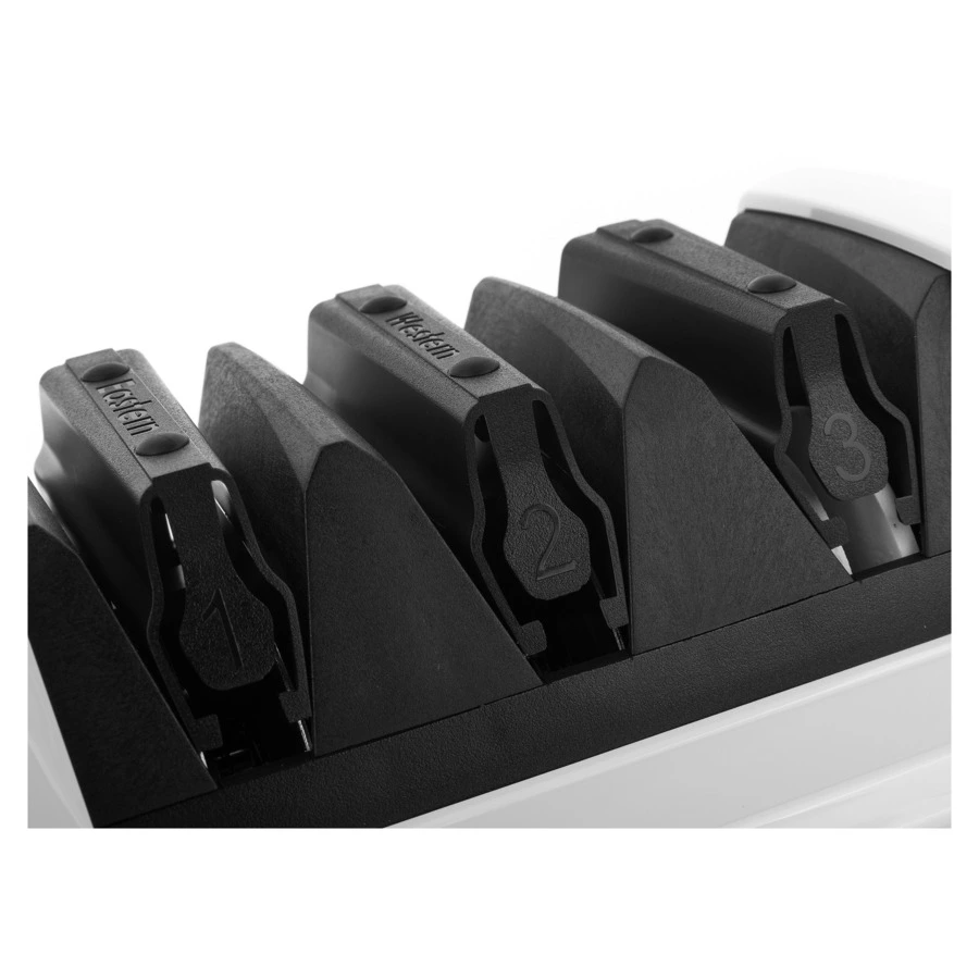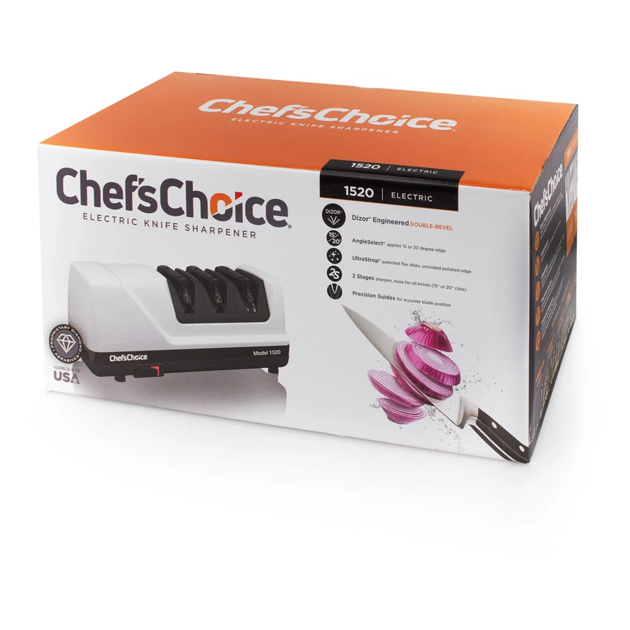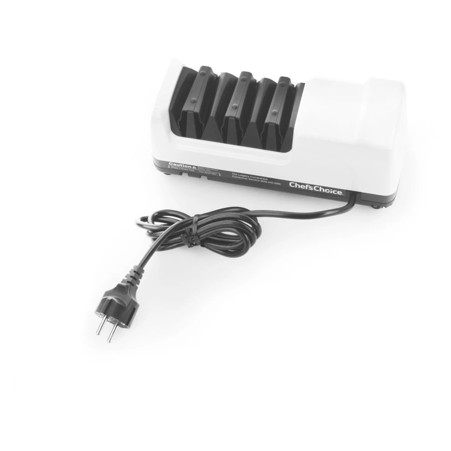 Уникальная электрическая точильная станция с тремя стадиями заточки, специально разработанная для заточки японских и европейских ножей. Первая стадия предназначена для заточки односторонних и двусторонних ножей, имеющих угол заточки – 15 °, вторая стадия - для европейских ножей (угол заточки 20 °). На третьей стадии благодаря композитным дискам, создаётся дополнительный микроскопический угол заточки, а также полируется режущая кромка, что позволяет надолго сохранить остроту ножа. В точильной станции используется система контроля угла заточки, которая автоматически выставляет нужный угол 20 °.