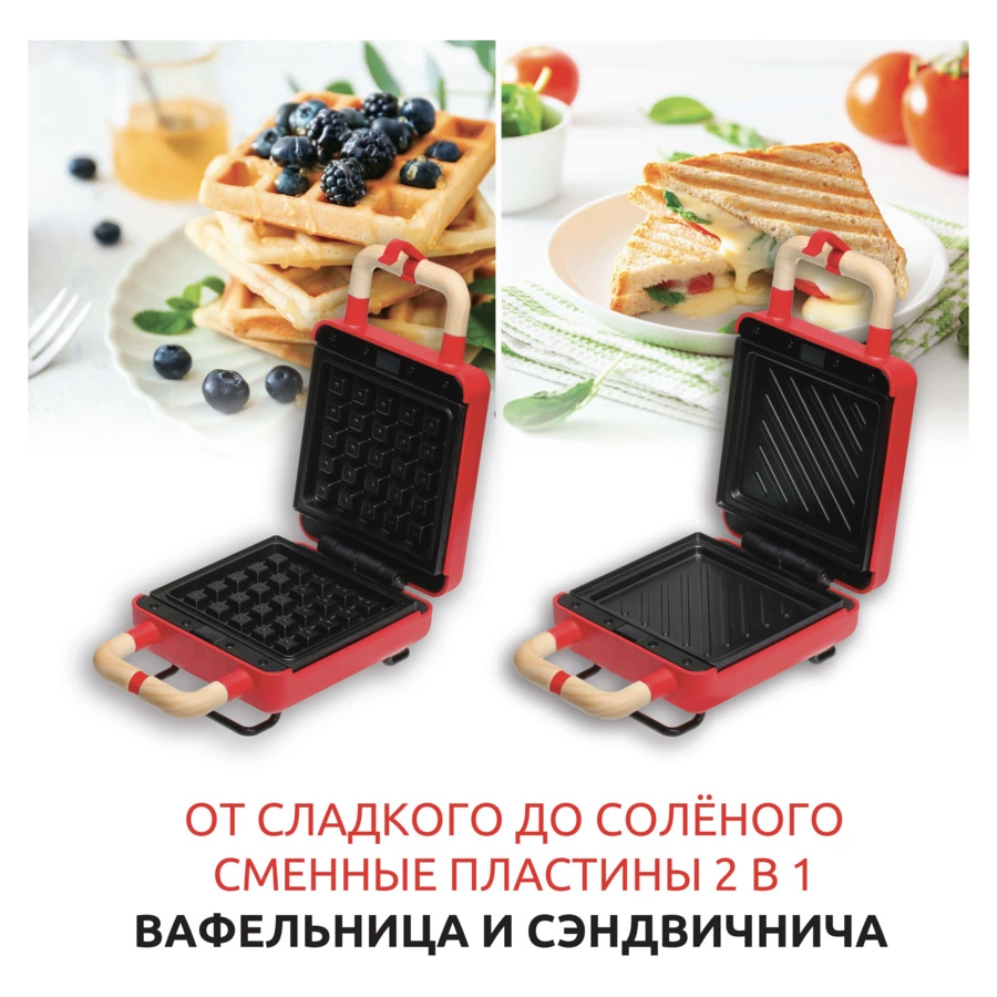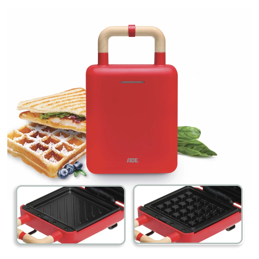 Вкусные вафли днём, пикантные бутерброды вечером: с вафельницей 2-в-1 никаких проблем! Две входящие в комплект пластинчатые вставки с антипригарным покрытием можно заменить одним щелчком. Их не только легко менять, но и легко мыть благодаря новейшему антипригарному покрытию. Вафельница представляет собой стабильный, высококачественный пластиковый корпус в трёх цветах: белом, чёрном или красном с шикарной матовой отделкой.