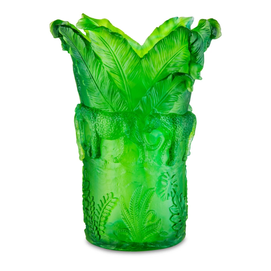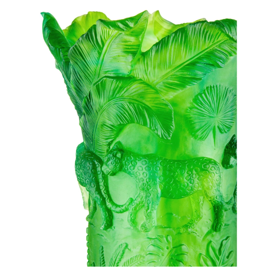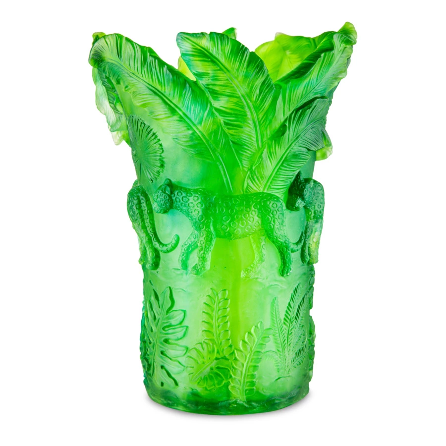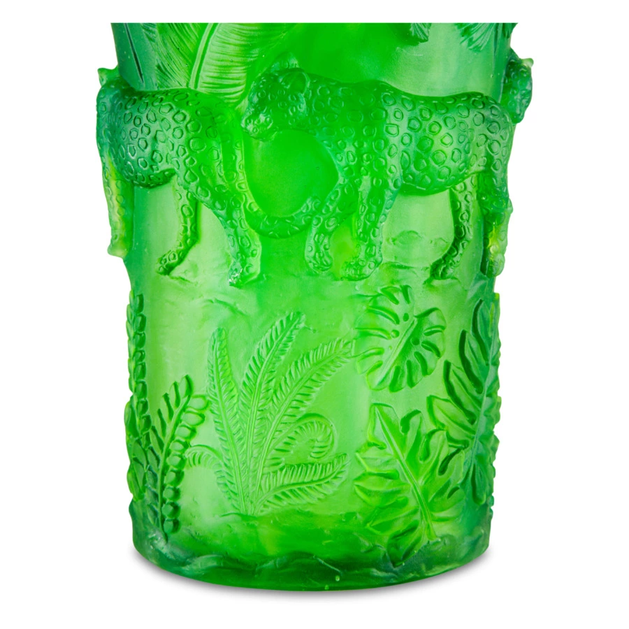 Ваза «Пантера» от бренда Decor de table перенесет вас в далекие джунгли с их богатой растительностью и грациозными хищниками. Цилиндрическая форма вазы идеально подходит для любых цветочных композиций. Впрочем, и без них она будет привлекать внимание своим дизайнерским оформлением. Высокая детализация позволяет разглядеть даже самые мелкие элементы декора: от прожилок на пальмовых листах до пятен на шкурах животных. Матово-зеленый цвет хрусталя удачно подчеркивает все детали и общий стиль изделия.