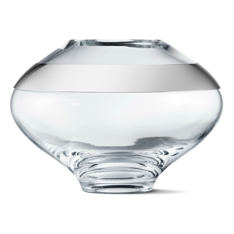 Ваза бренда Georg Jensen, основанного Георгом Йенсеном в Дании, изготовлена из качественных материалов: выдутого вручную стекла и нержавеющей стали, отполированной до блеска. Утолщённое дно делает конструкцию максимально устойчивой. Изделие из коллекции «Дуо» обладает гладкой текстурой и плавными линиями. Благодаря минималистичному дизайну предмет украсит любой стиль интерьера. Зеркальная металлическая вставка в виде кольца красиво отражает цветы, когда они находятся в вазе.