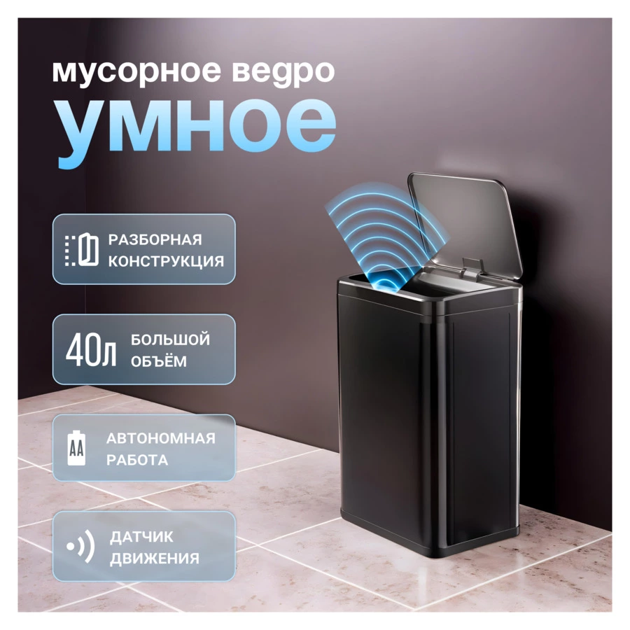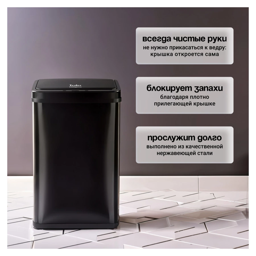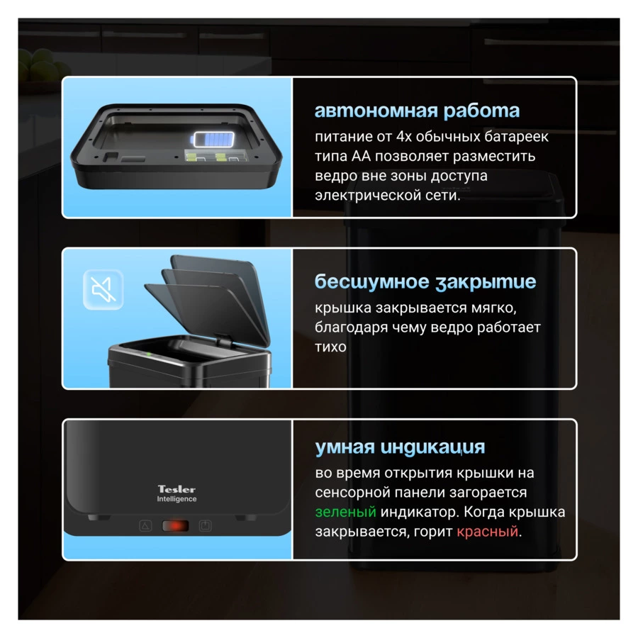 Умное ведро для мусора Tesler STB-40F – это простое и технологичное решение утилизации отходов. Сенсорный датчик самостоятельно открывает крышку при поднесении руки на расстояние 15-25 см от датчика. Больше не нужно прикасаться к ведру, чтобы выкинуть мусор, и ваши руки останутся чистыми. Крышка автоматически закроется сама через 5 секунд. Предусмотрен также ручной режим, в котором управлять открытием и закрытием крышки контейнера можно кнопкой, расположенной на фронтальной панели ведра. Питание осуществляется посредством 4-х батареек АА (не входят в комплект).