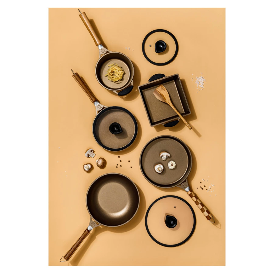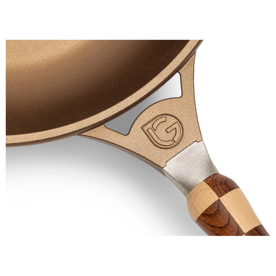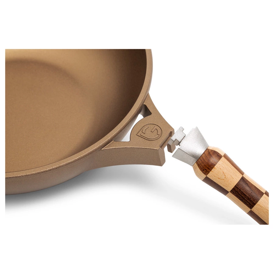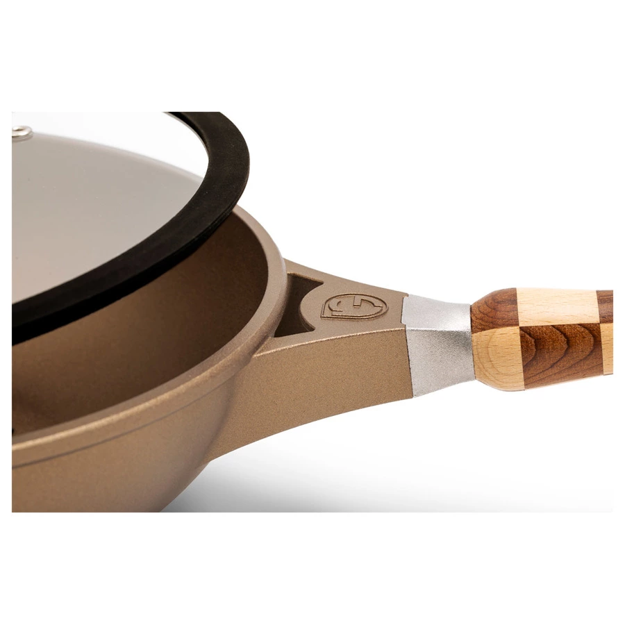 Модель изготовлена из литого алюминия – лёгкого, но прочного материала с высоким показателем теплопроводности. Дно толщиной 6,5 мм способствует равномерному прогреву продуктов, что напрямую влияет на вкус и консистенцию готового блюда. Четырехслойное антипригарное покрытие, разработанное ведущими инженерами Италии, отличается исключительной износостойкостью. Благодаря высоте бортов 8 см и объёму 3,8 л сковорода подойдет для приготовления разнообразных азиатских и европейских блюд на всю семью или большую компанию гостей. Посуда от Luchetti – это не только функциональность, но и стильный дизайн. Съёмная ручка, выполненная из двухцветного ясеня, имеет эффектный шахматный узор. Золотая отделка придает изделию роскошный внешний вид.