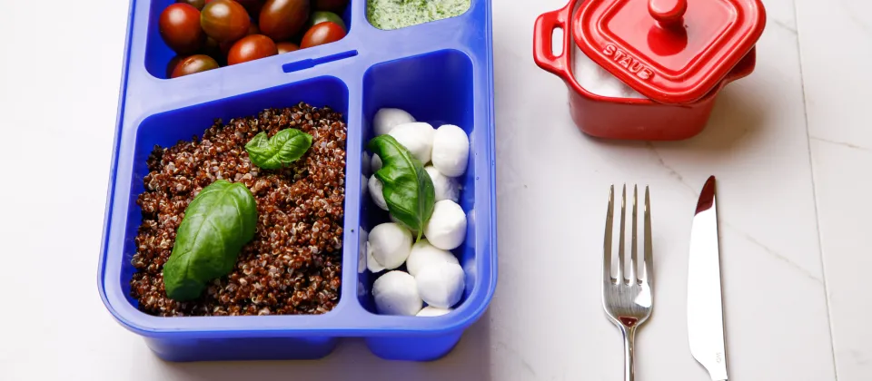 - В большую секцию контейнера выложите киноа. В отдельные отсеки — черри, шарики моцареллы и соус песто.