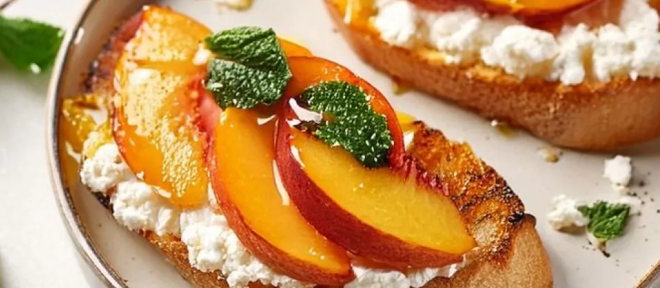 - На каждый тёплый ломтик хлеба выложите слой рикотты, сверху — несколько долек персика.