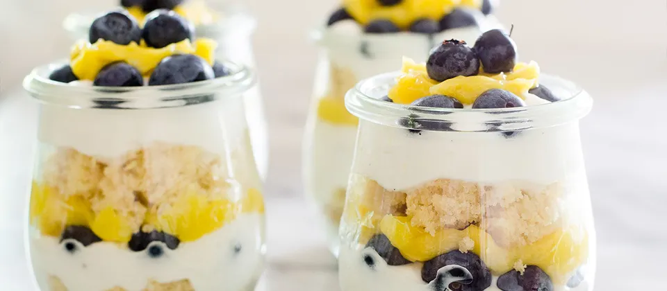 - В бокал положите слой бисквита, слой бананового мороженного и слой черничного.