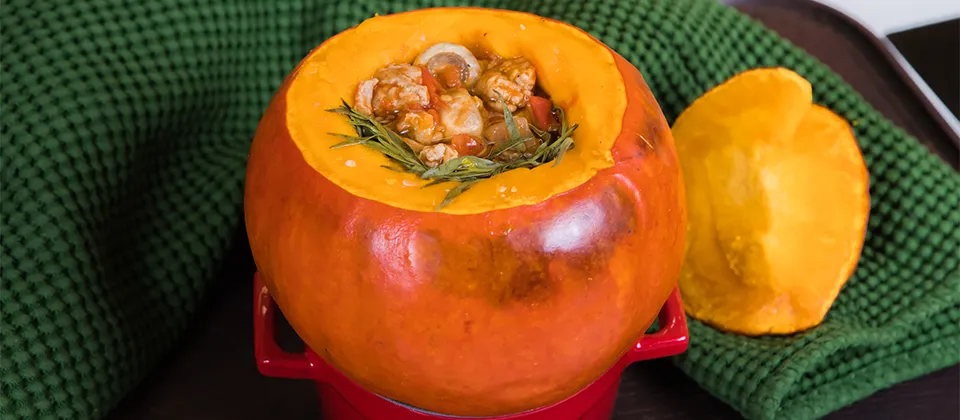 - Наполнить тыкву рагу, добавить веточки тархуна, накрыть тыквенной крышкой и поставить в духовку на 180 градусов на полчаса.