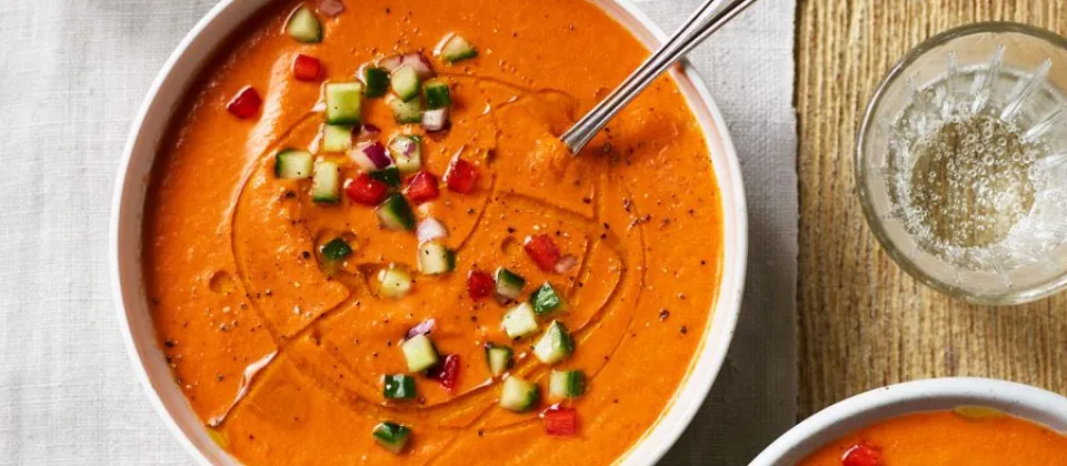 - Помидоры черри порезать пополам, оставшийся огурец кубиком. Разлить суп по тарелкам и посыпать овощами.