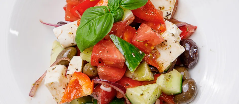 - Огурец, томат и перец нарезать крупными треугольниками. Красный лук нарезать тонкими четверть кольцами. Маслины можно оставить целиком или нарезать на половинки.