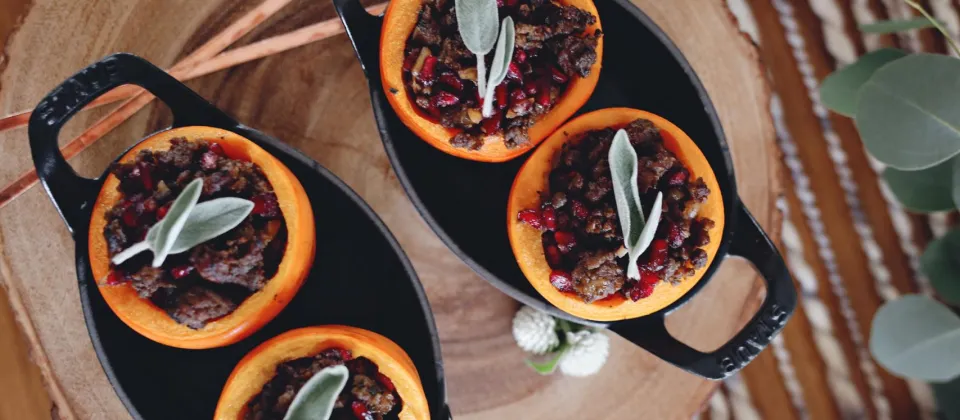 4. У хурмы отрезать верхушки и вычистить сердцевину. Начинить хурму фаршем.