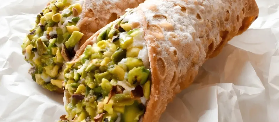 - Для начинки взбить миксером рикотту с йогуртом и сахарной пудрой. Добавить в неё цедру двух лимонов, сок одного лимона и мелко порубленные фисташки.