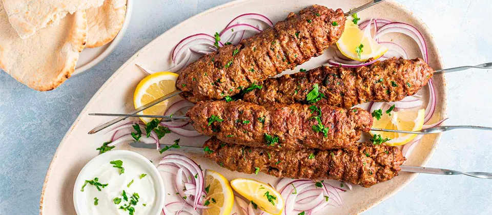 - У лепёшек отрезать краешек и прогреть их на сухой сковороде так, чтобы они открылись. Смазать лепёшки соусом, выложить в них кебабы и свежий шпинат.