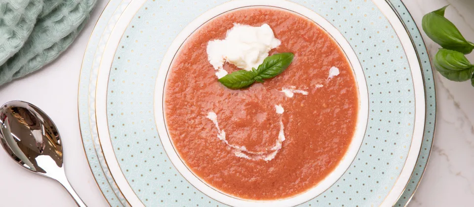 - Подавать суп холодным с листиком базилика и страчателлой.