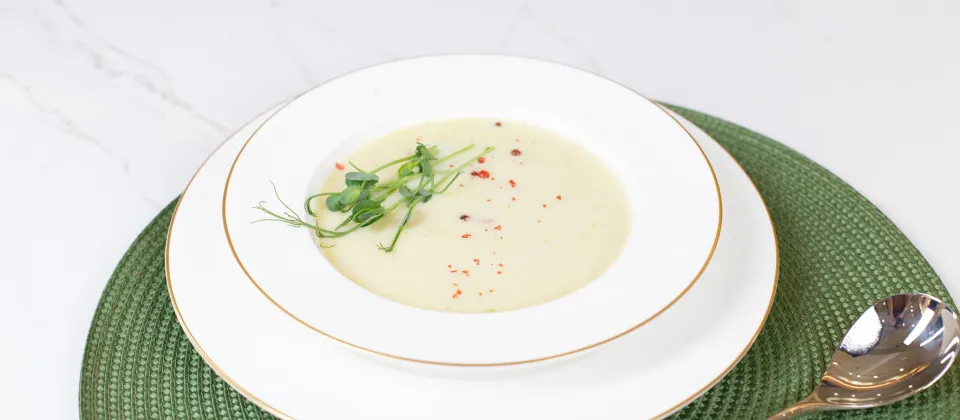 - Пробить суп блендером, затем добавить к нему сливки, посолить и поперчить по вкусу.