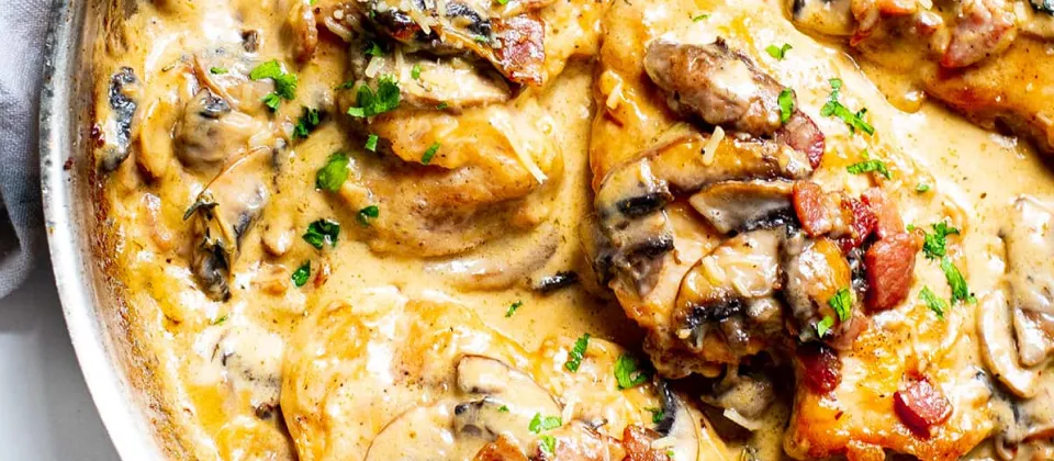 - Влейте сливки, доведите до кипения, затем уменьшите огонь и верните курицу в сковороду. Тушите 10 минут.