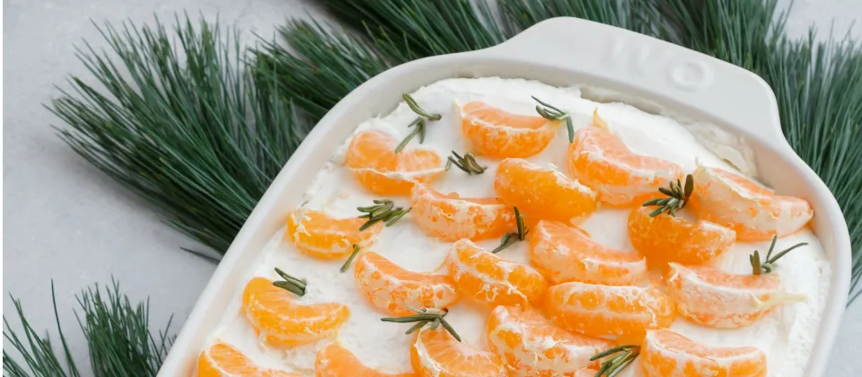 - Сверху распределите половину крема, добавьте мандариновое пюре и кусочки фруктов.