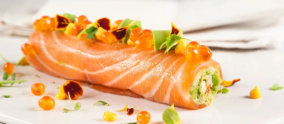 5. Выложить начинку на лосося и завернуть в плотный ролл.