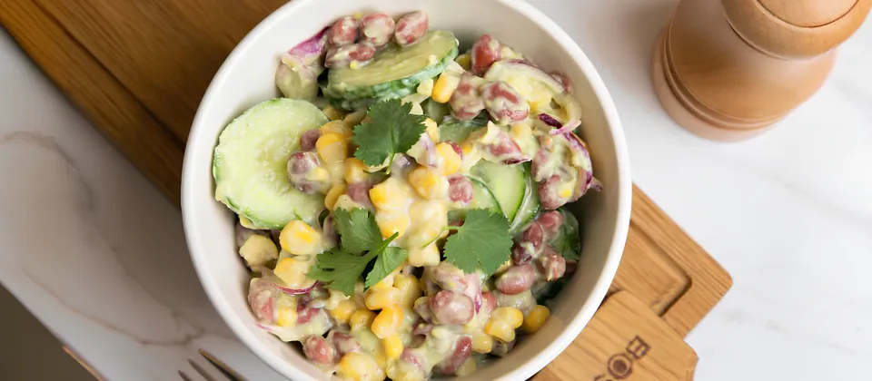 - Соберите салат. В глубокой миске соедините огурцы, красный лук, фасоль и кукурузу.