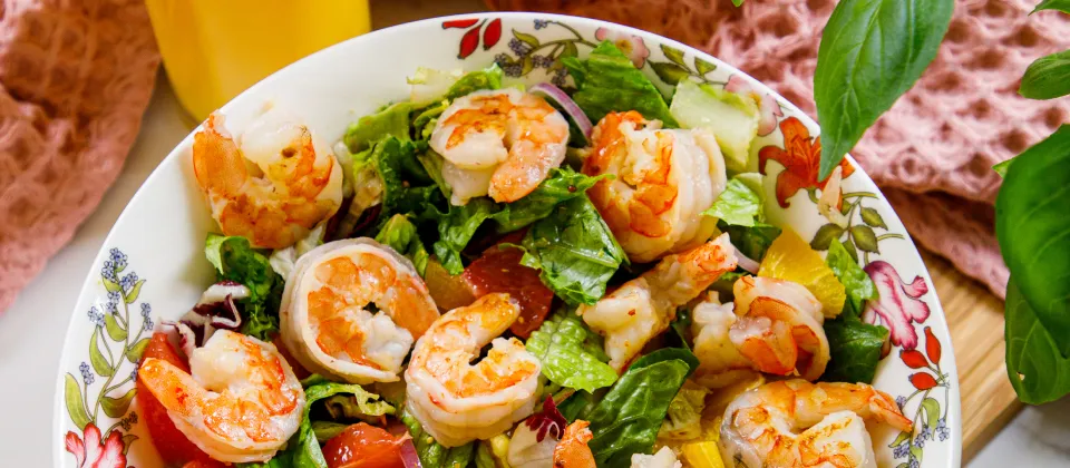 - В миске листья салата смешать с соусом, добавить лук, цитрусовые и креветки.