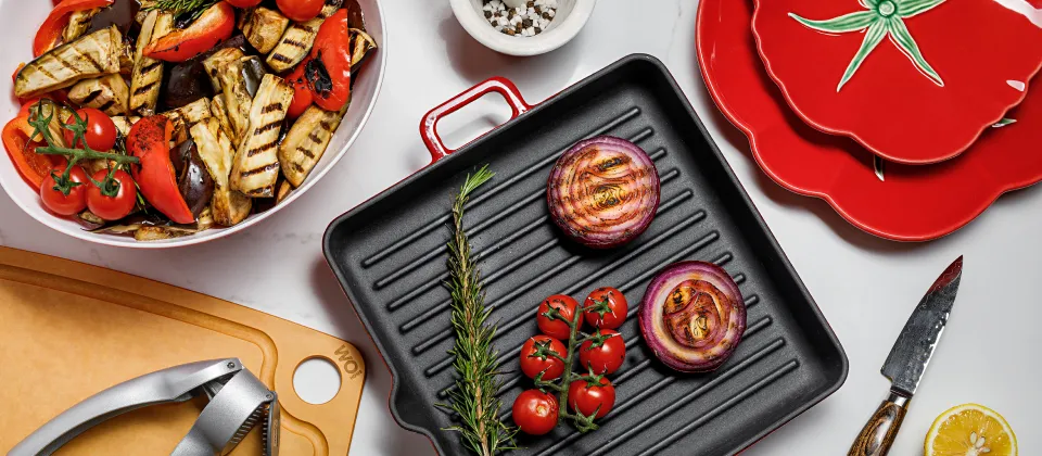 - Переложите овощи и лук-порей на сковороду гриль и обжарьте на среднем огне, постоянно переворачивая, в течение 7 минут, переложите в термокастрюлю, и дайте настояться в течении пяти минут.