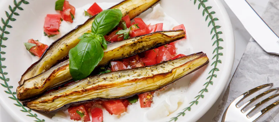 - На дно тарелки выложить сыр бурата, разобрав его вилкой, затем томаты и баклажаны.