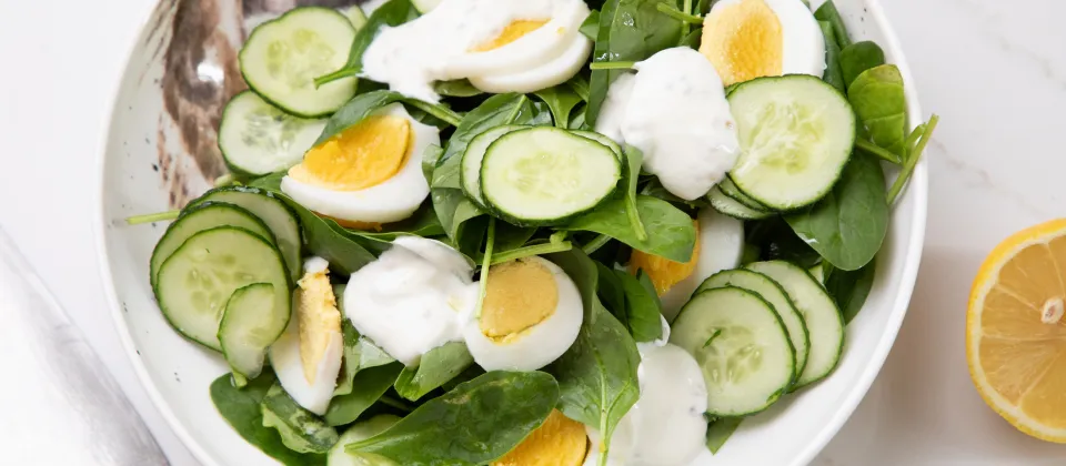 - Соберите салат: шпинат, огурец, яйца и лук.