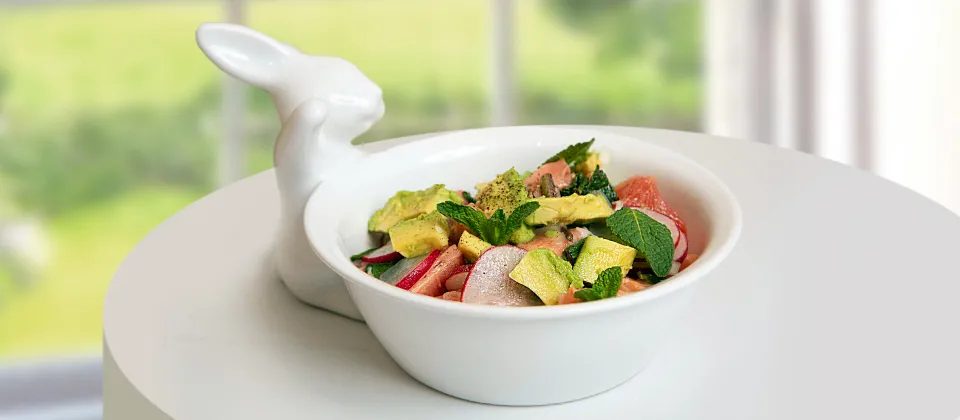 - Выложить севиче на красивую тарелку, добавить авокадо, листочки мяты и поперчить.